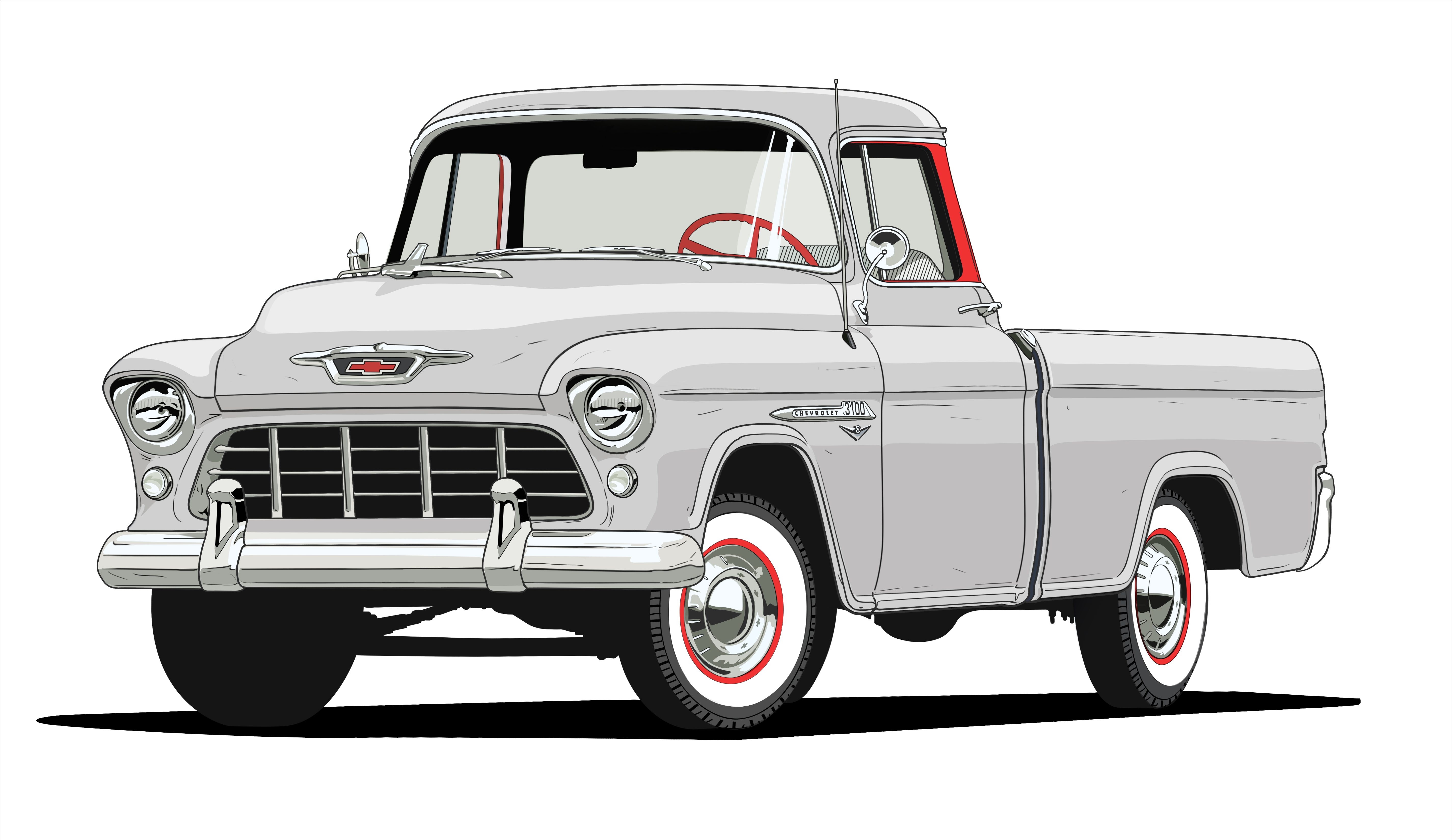 1955 3124 Series Cameo Carrier – Chevy’s first fleetside design. The bed surface is flush with the cab and fender, making for one complete, elegant shape from front to back.