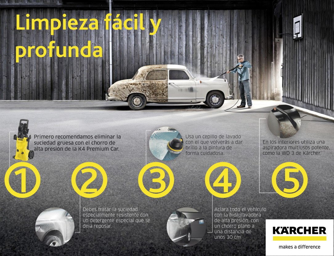 - Primero se recomienda eliminar la suciedad gruesa con el chorro de alta presión de la K4 Premium Car.