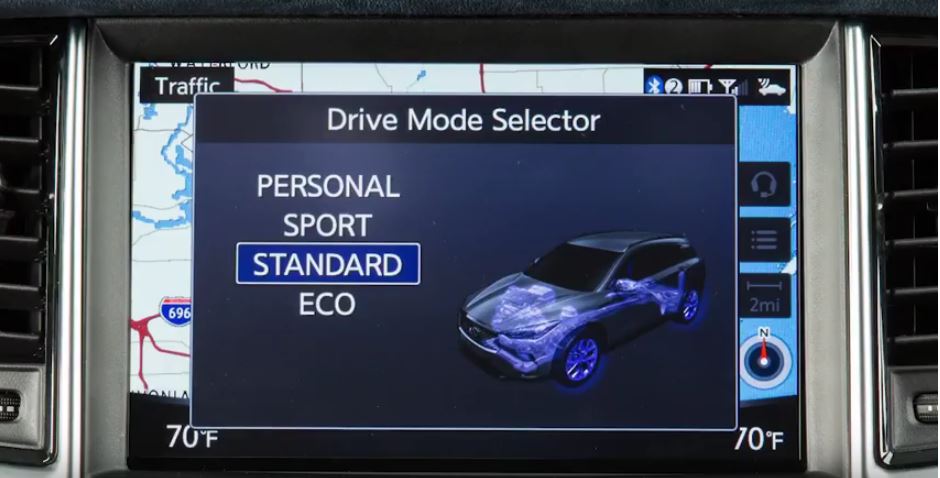 - Personal mode: Se utiliza para ajustar el modo de dirección y conducción, para configurar el modo personal el usuario debe presionar el botón de Menú, después seleccionar Infiniti Drive Mode Selector en la pantalla de abajo para ajustar los sistemas que se desean personalizar (como la transmisión del motor, dirección y otras asistencias que el conductor podrá decidir si desea mantener encendidas o apagadas).