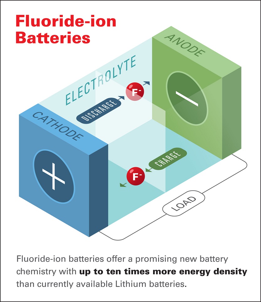 Las FIBs son una alternativa atractiva a otros tipos potenciales de electroquímicas de baterías de alta energía, como las basadas en químicas de litio o hidruros de metal, que generalmente están limitadas por las propiedades inherentes de sus electrodos. Debido al bajo peso atómico del fluoruro, las baterías recargables basadas en ese elemento pueden ofrecer densidades de energía muy altas – hasta 10 veces mayor que el valor teórico de las tecnologías de iones de litio. Sin embargo, mientras las FIBs se consideran un fuerte contendiente para la “siguiente generación” de dispositivos de almacenamiento de alta densidad de energía, están limitados por sus requerimientos de temperatura.