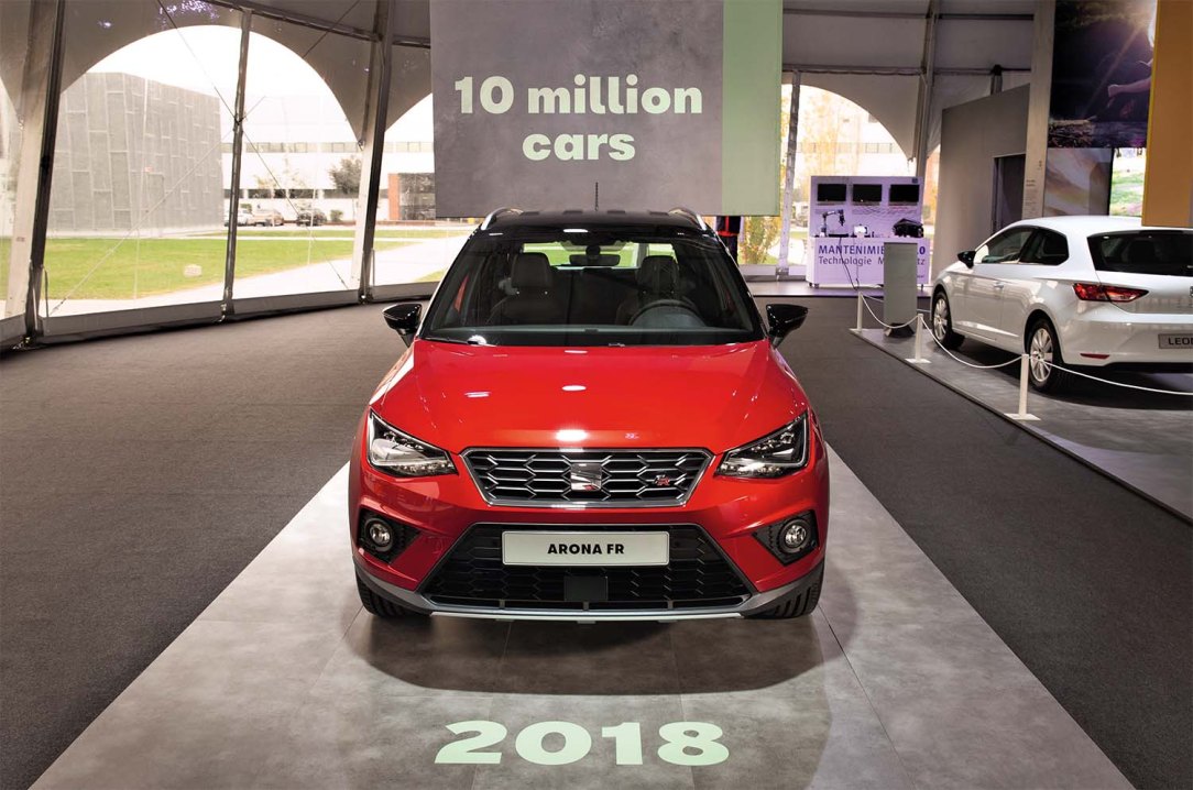 El vehículo 10 millones, un Arona FR 1.5 TSI que combina los colores desired red y midnight black, está expuesto esta semana en la fábrica de Martorell, en la exposición que conmemora su 25 aniversario. Este Arona se fabricó sobre la plataforma MQB A0, que comparte con el modelo Ibiza y el recién llegado Audi A1. SEAT fue la primera marca del Grupo Volkswagen en utilizar esta plataforma, que permite una mayor flexibilidad de fabricación, ya que soporta diferentes modelos y tipos de carrocería dentro del mismo segmento, lo cual ha dado paso a que Martorell incorpore a sus líneas tres nuevos modelos en los últimos 18 meses.