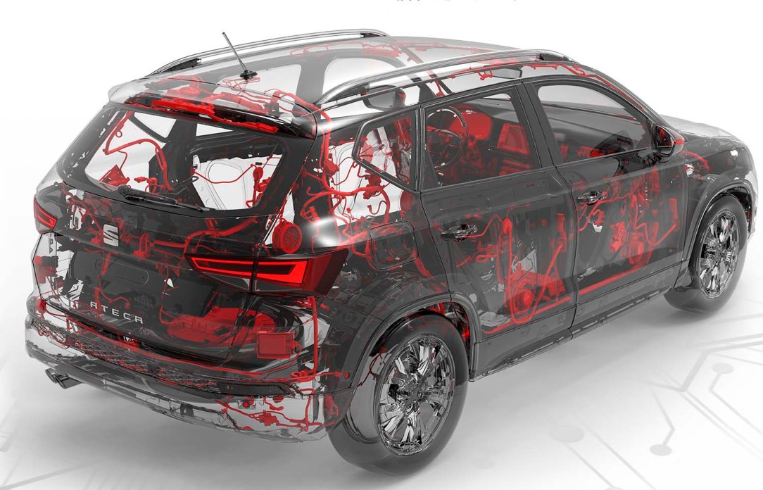 - Una red eléctrica que dibuja su silueta: Modelos como SEAT Ateca tienen más de 1,350 cables que, puestos en línea recta, recorrerían más de 2,200 metros, una longitud similar a la de una pista de aterrizaje. Se ramifican en más de 30 circuitos que “garantizan la práctica totalidad de funciones que tiene un auto y trasladan la energía de un lugar a otro, como ocurre con la sangre que circula por el organismo”, asegura Pedro Manonelles, ingeniero del Centro Técnico de SEAT. La parte del tablero frontal es la zona del vehículo donde se concentra más cableado. Por aquí llegan a pasar más de 200 cables formando interconexiones de más de 4 centímetros de grosor.