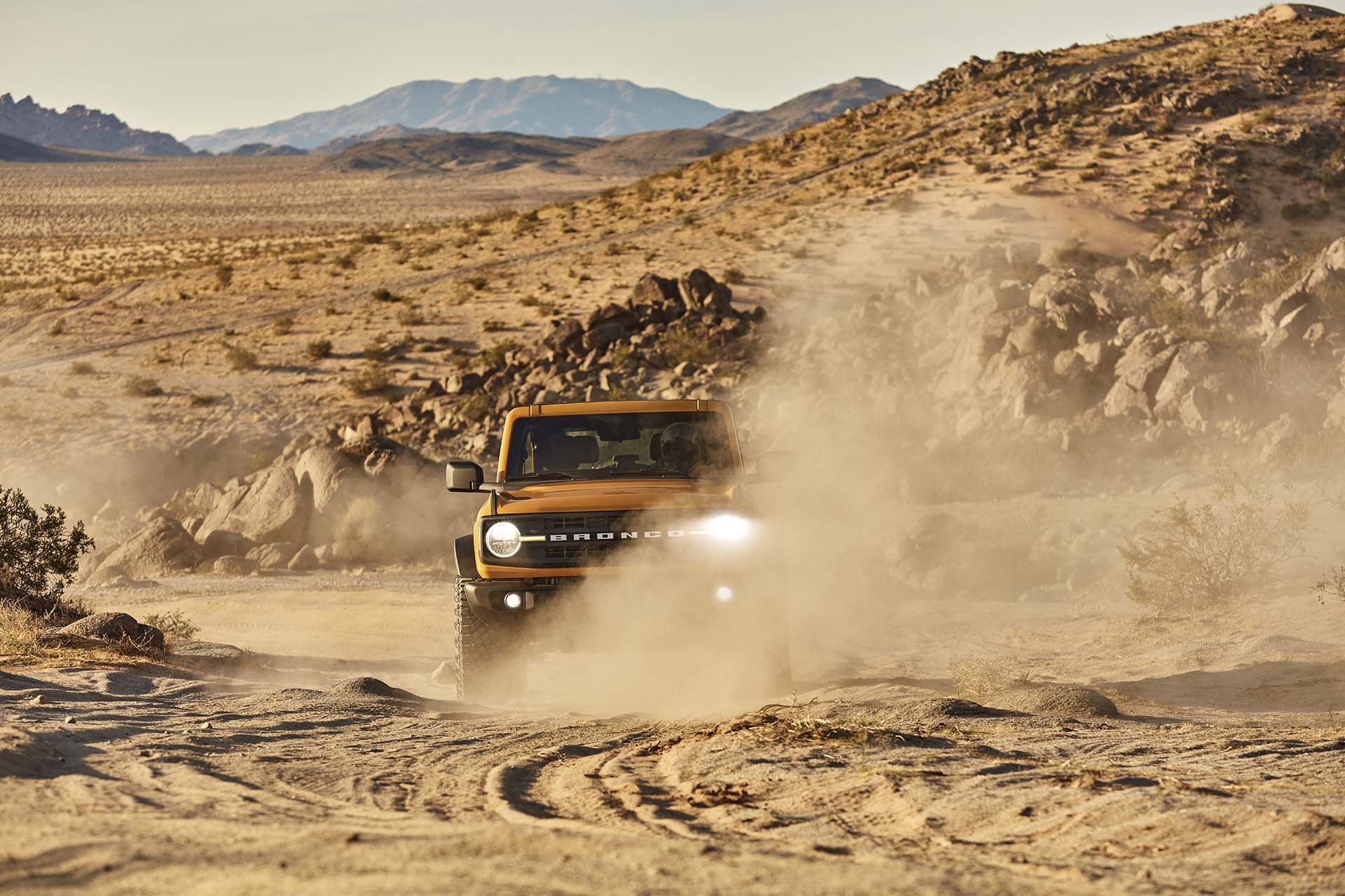 Pre-production 2021 two-door Bronco Black Diamond series in Cyber Orange Metallic Tri-Coat with available Sasquatch™ off-road package.