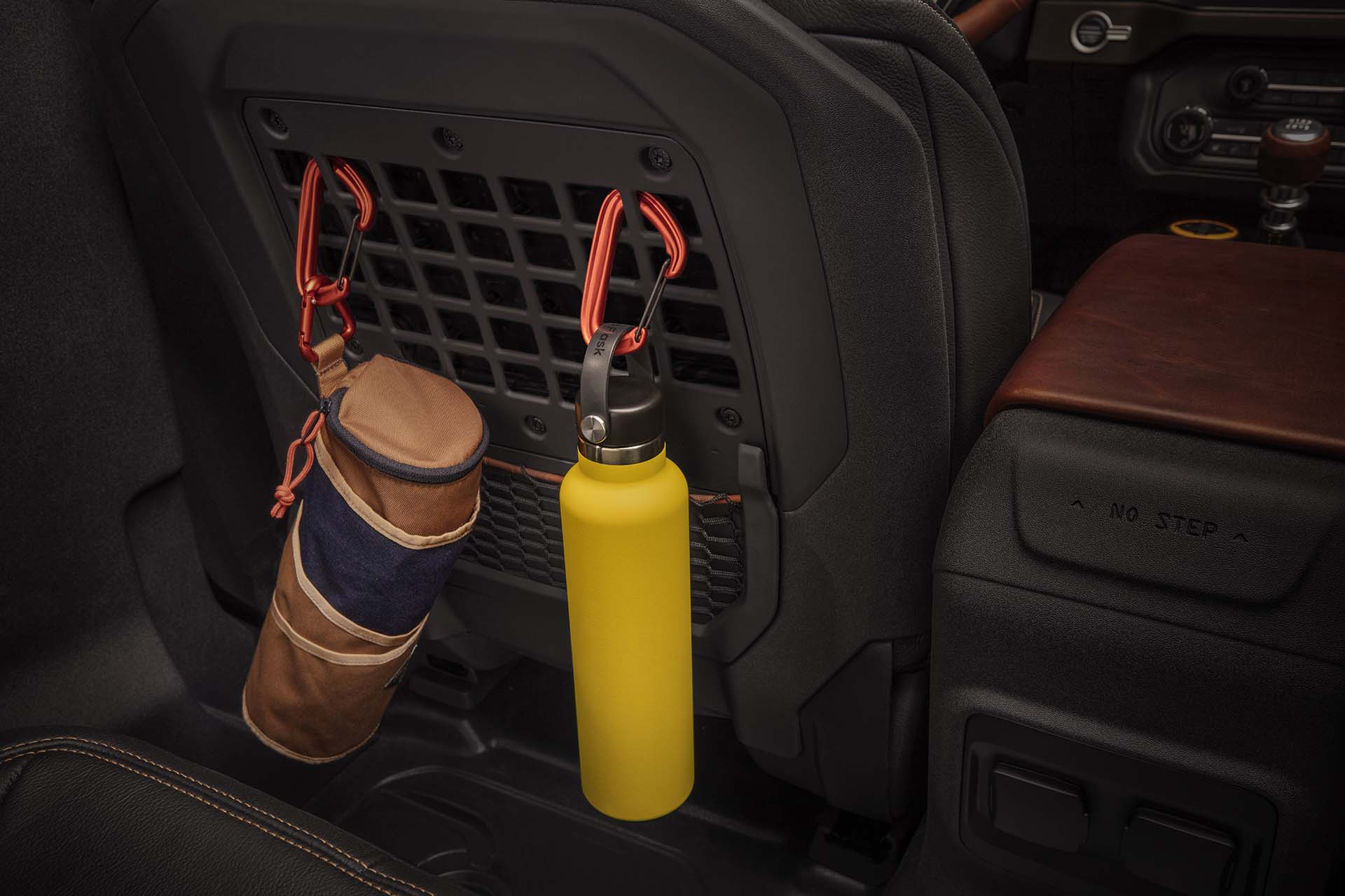MOLLE hooks are mounted in the seatbacks for safe transport when the trails get rough in this prototype version of the all-new 2021 Bronco (not representative of production model). (Static display on private property with aftermarket accessories not available for sale.)