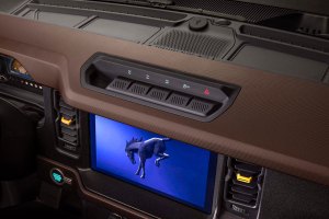 Instrument panel-mounted hero switches, an easy reach for the driver, feature seamless rubber touchpoints to protect against dirt and water and are easily washable in this prototype version of the 2021 Bronco (not representative of production model). (Static display on private property with aftermarket accessories not available for sale.)