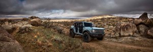 Pre-production 2021 Bronco four-door Badlands series with available Sasquatch™ off-road package in Cactus Gray with the doors, top and rear quarter windows removed.