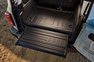 A slide-out rear tailgate provides greater convenience for two- and four-door Bronco models. (Prototype not representative of production vehicle.)