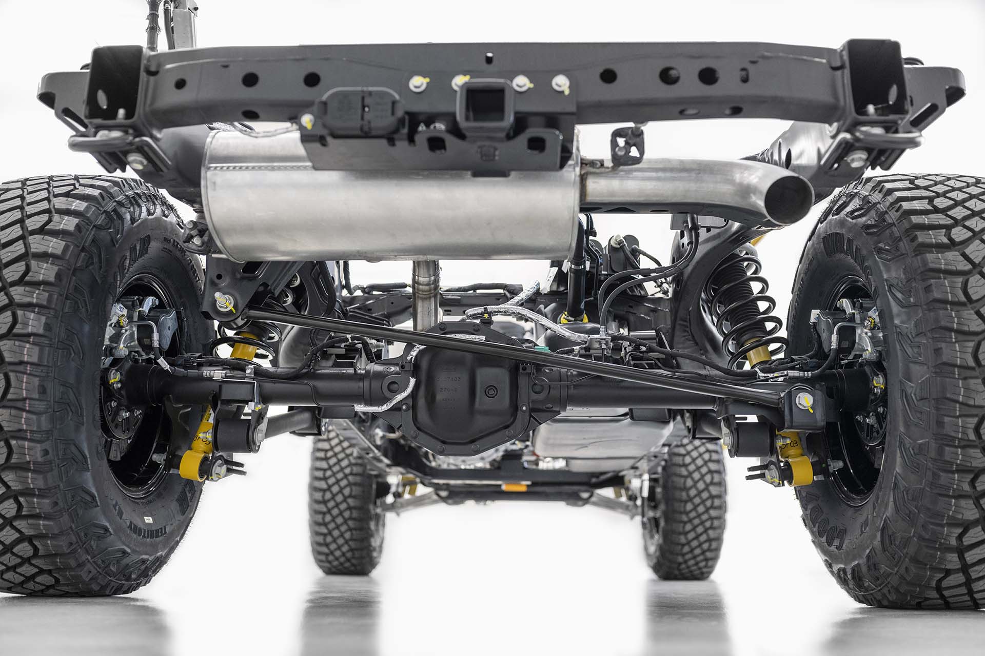 2021 Bronco rear chassis with five-link solid axle, available Bilstein coil-over shock absorbers and M220 Dana 44 differential with electronic locking.