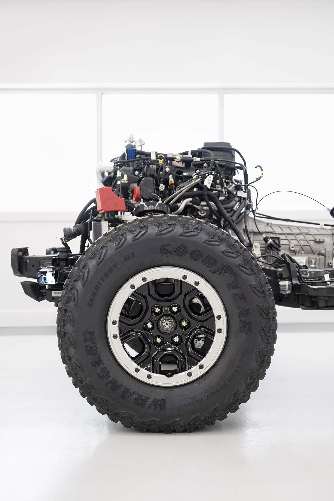 2021 Bronco chassis and powertrain with Sasquatch Package featuring 17-inch high-gloss black aluminum alloy wheels, warm alloy beauty ring and beadlock-capable 35-inch LT315/70R17 mud-terrain tires.