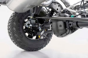 Closeup of the 2021 Bronco solid rear axle linkage and the M220 Dana 44 differential with electronic locking.