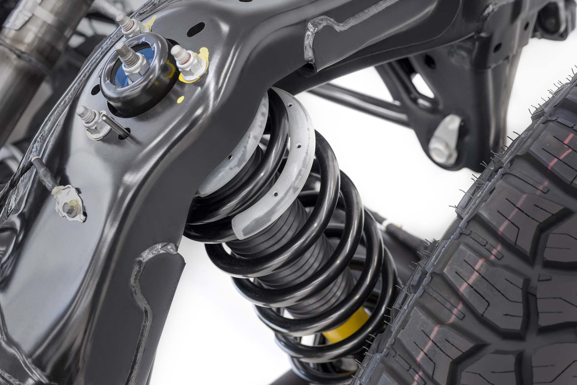 Rear coil-over spring/shock absorber mounted to the fully boxed high-strength steel Bronco frame.