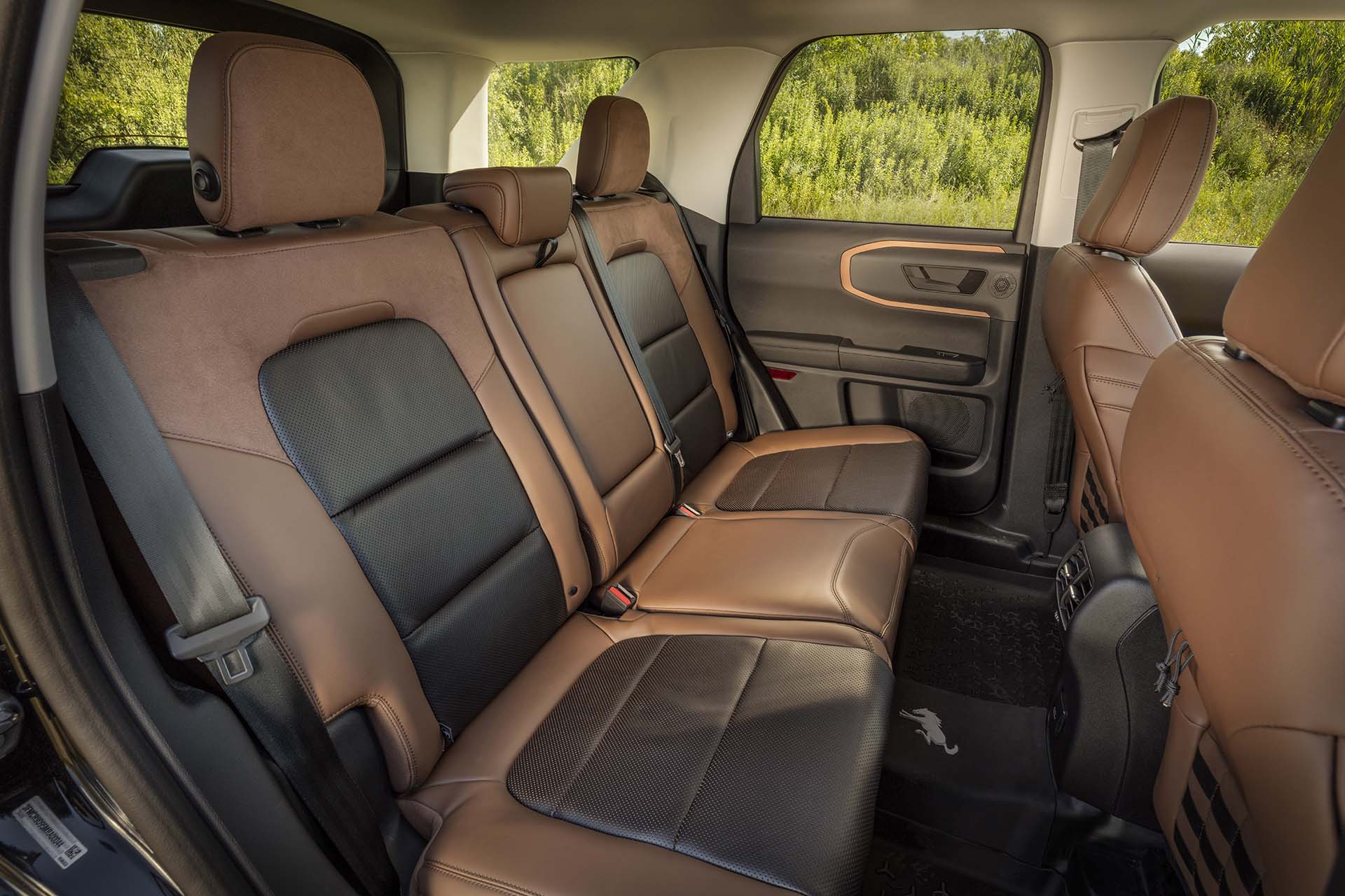 The available Badlands Package on Bronco Sport includes 60/40 split fold-flat second-row leather two-tone seats with a flip-down center armrest and cupholders. (Pre-production model pictured.)