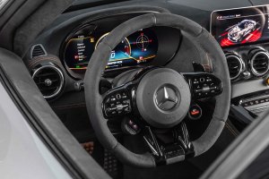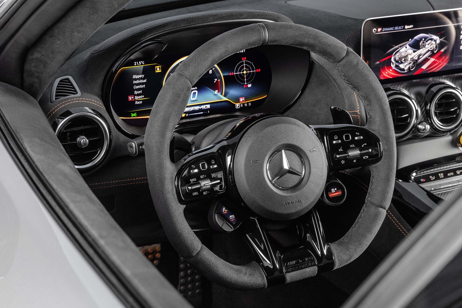 Mercedes-AMG GT Black Series (combined fuel consumption: 12,8 l/100 km, combined CO2 emissions: 292 g/km), 2020, Interieur, Steering wheel, AMG performance steering wheel microfibre DINAMICA with AMG steering wheel buttons