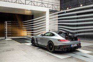 Mercedes-AMG GT Black Series (Kraftstoffverbrauch kombiniert: 12,8 l/100 km, CO2-Emissionen kombiniert: 292 g/km), 2020, Windtunnel, Exterieur, Aerodynamik, hightechsilber, Heck, doppelter Heckflügel, Seitenansicht