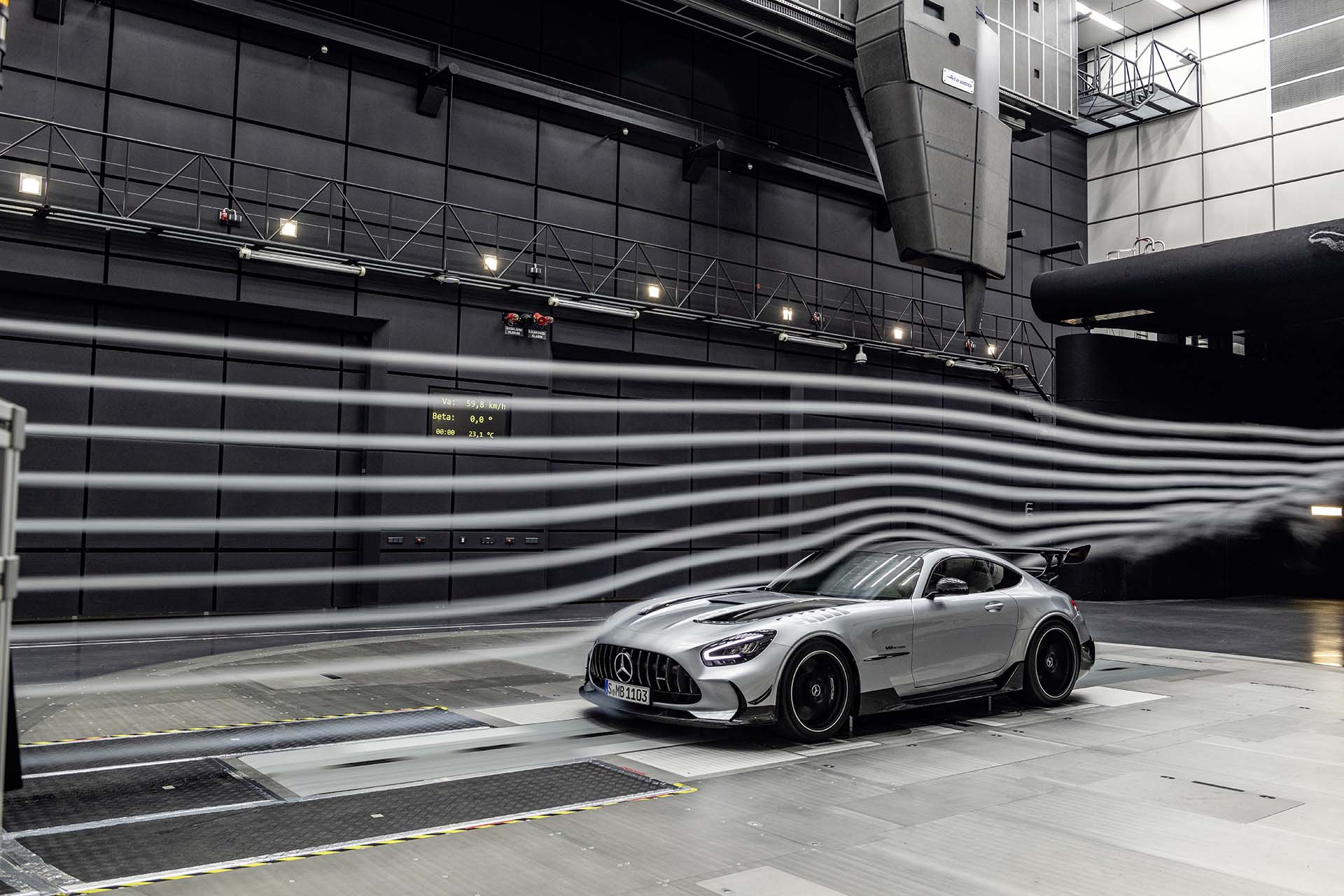 Mercedes-AMG GT Black Series (Kraftstoffverbrauch kombiniert: 12,8 l/100 km, CO2-Emissionen kombiniert: 292 g/km), 2020, Windtunnel, Exterieur, Aerodynamik, hightechsilber, Front, Seitenansicht