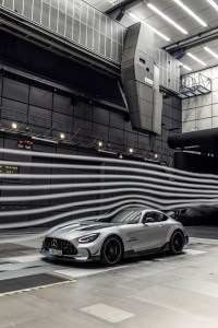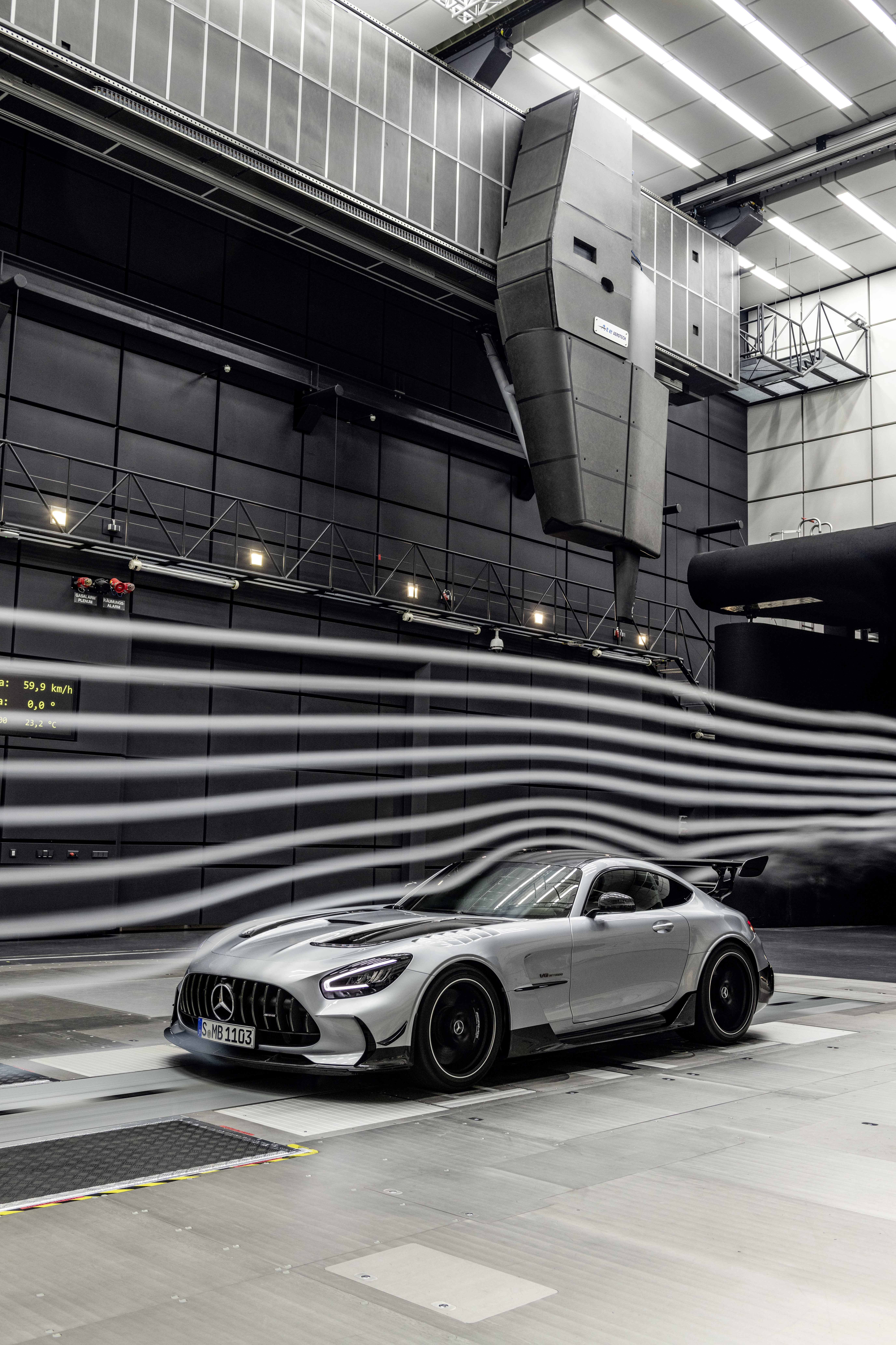 Mercedes-AMG GT Black Series (Kraftstoffverbrauch kombiniert: 12,8 l/100 km, CO2-Emissionen kombiniert: 292 g/km), 2020, Windtunnel, Exterieur, Aerodynamik, hightechsilber, Front, Seitenansicht