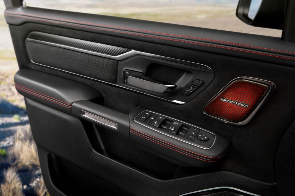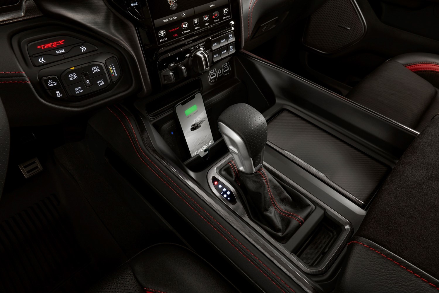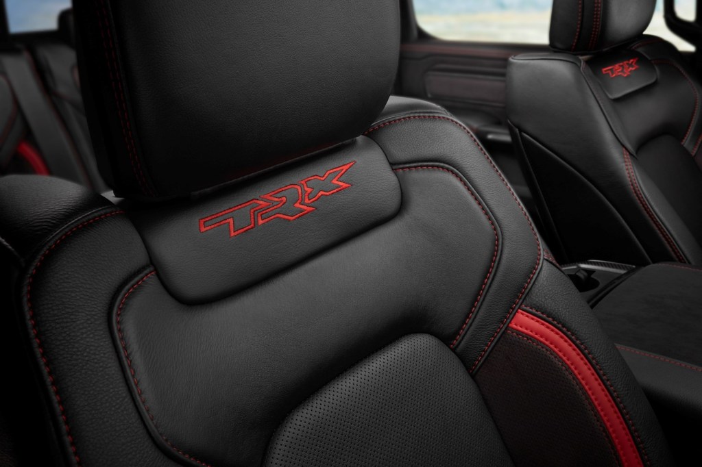 La nueva TRX cuenta con tres opciones de interior, basadas en las cabinas de la Rebel y de la Limited, que incluyen interior premium de tela y vinil, de cuero y gamuza, y de cuero y gamuza con acentos rojos y de fibra de carbón.