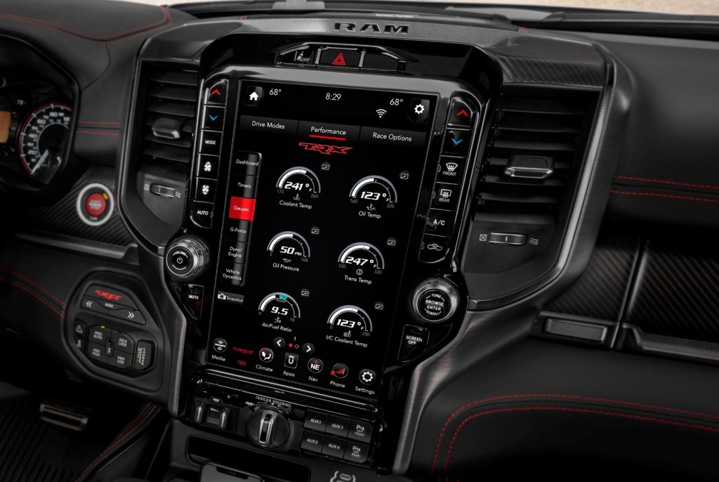 Para gestionar toda la tecnología que incorpora la TRX, el conductor cuenta con la pantalla Uconnect 4C NAV de 12 pulgadas completamente configurable que puede mostrar una única aplicación o dividirse en dos mitades para operar dos sistemas al mismo tiempo. El Uconnect 4 permite la integración de dispositivos móviles personales vía CarPlay y Android Auto, y una auténtica experiencia personalizada que se realiza a través del sistema de audio Harman Kardon de 900 watios, 19 bocinas y 10 subwoofers.