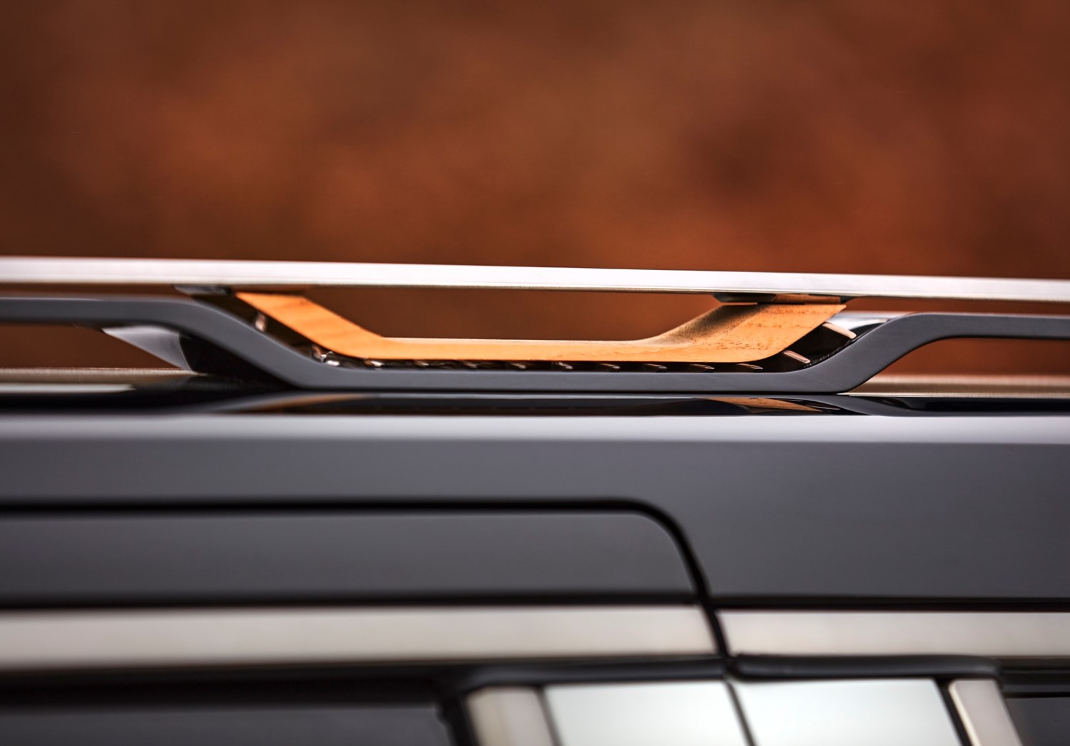 Un amplio techo panorámico proporciona abundante luz natural a todos sus ocupantes y expande visualmente el espacio interior del vehículo. Está rodeado por dos rieles con cuatro amarres de doble presilla con madera de teca y un entramado de bronce. La madera teca, elegante y resistente al mismo tiempo, ha trascendido un uso casi exclusivo en yates y en propiedades extravagantes, y hoy es la madera premium de elección de diseñadores de muy variadas industrias.