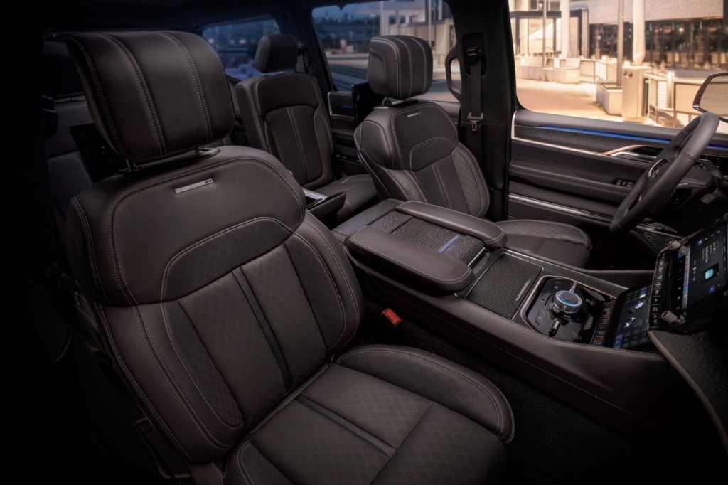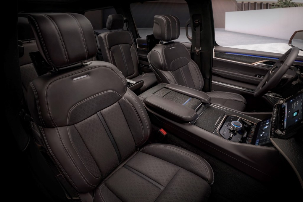Haciendo honor a su nombre, el Grand Wagoneer Concept ofrece un enorme interior para siete personas gracias a sus confortables dos primeras filas con butacas de capitán independientes y a una tercera fila de asientos para tres pasajeros (la primera vez que se ofrece en un Grand Wagoneer). La relajada atmósfera del interior, acentuada por el uso de luz de ambiente personalizable tanto en color como en intensidad, ofrece una liberadora sensación de confort para todos los ocupantes.