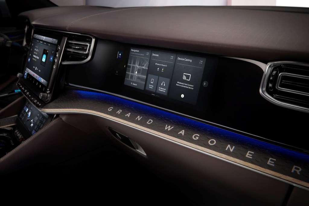 Esta franja de cristal de gema parece flotar sobre una placa estructural de aluminio sin procesar, el mismo material utilizado para las bocinas de las puertas, la palanca de velocidades y los contornos de las salidas de ventilación. También exhibe, por todo el panel de instrumentos y en las puertas delanteras, una incrustación 3D de madera de sicómoro tratada térmicamente y la palabra Grand Wagoneer inscrita en aluminio en el lado del copiloto.