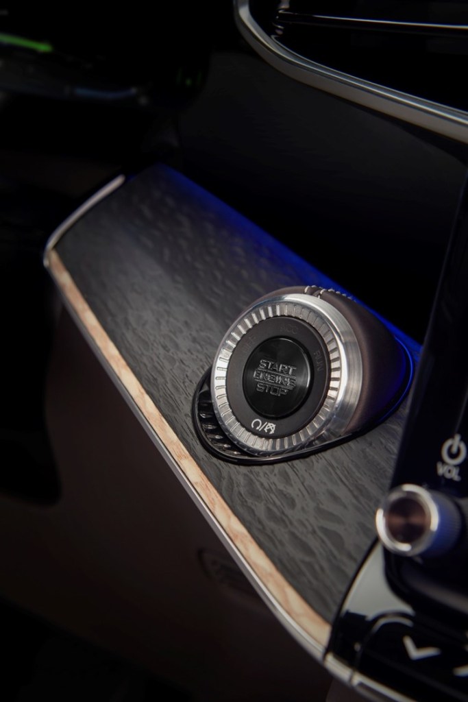 Otros detalles llamativos son los acentos en color negro Obisidian Black y la icónica parrilla de siete barras que, en esta nueva interpretación, exhiben una obscura pantalla. El espacio superior y el existente entre las barras está iluminado por varios LEDs con un diseño original, algo que contribuye a enfatizar las dimensiones de la fascia delantera. A ambos lados de la parrilla se ubican proyectores LED bifuncionales acoplados en madera de teca genuina.