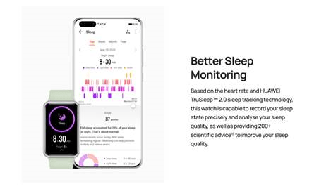 Además, con la tecnología de inteligencia artificial (IA) de Huawei, el smartwatch puede identificar con precisión seis problemas típicos de sueño, incluyendo dificultad para dormirse, sueño ligero, inquietud, despertar temprano, demasiados sueños y un horario irregular de trabajo y descanso. Con todos estos datos y el análisis, el HUAWEI WATCH FIT proporciona cientos de sugerencias personalizadas para mejorar el sueño. Para esto, el usuario no tiene que preocuparse en que la batería se termine por la noche, ya que es de larga duración, es decir, que los usuarios pueden monitorear su sueño cada noche para mejorar su salud.