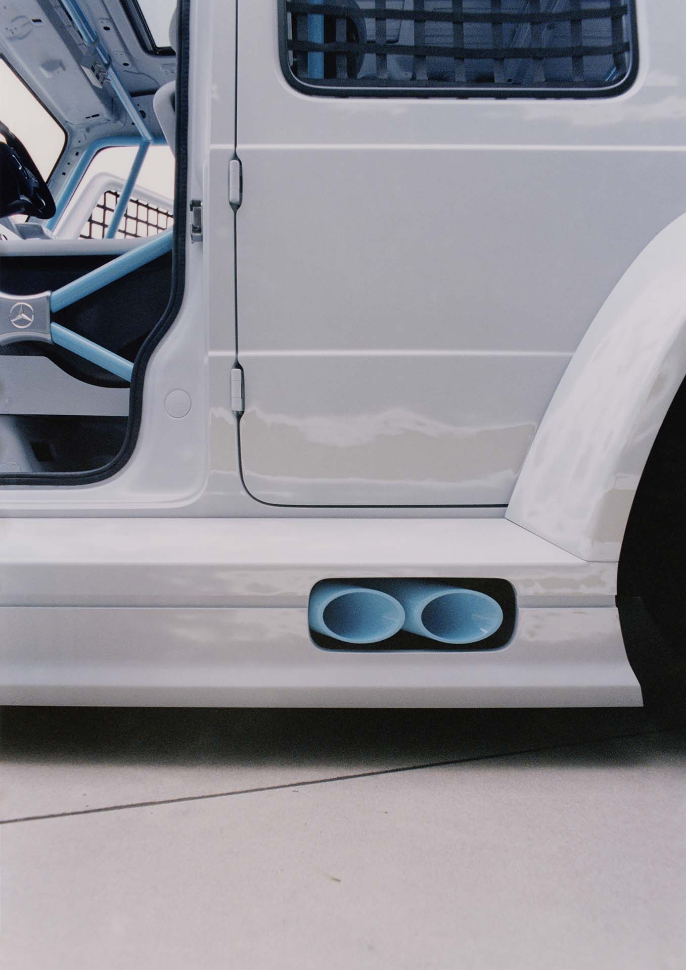 El exterior se mantiene lo más limpio posible para enfatizar la silueta icónica de la Clase G, demostrando su carácter monolítico. El diseño final deja al descubierto sus métodos de construcción y celebra las imperfecciones artesanales que lo hacen único. La pintura se lijó parcialmente a mano para crear una sensación de simplicidad atemporal. Las soldaduras se celebran como motivos de diseño clave, ya que la artesanía ocupa un lugar central. Las luces intermitentes, los retrovisores exteriores y la barra del parachoques se han eliminado y la carrocería del automóvil se ensancha y se baja, para un efecto más deportivo. Sin embargo, la personalidad distintiva de la Clase G permanece intacta, y una exageración de los neumáticos y la rueda de repuesto exudan el carisma inimitable de este vehículo.