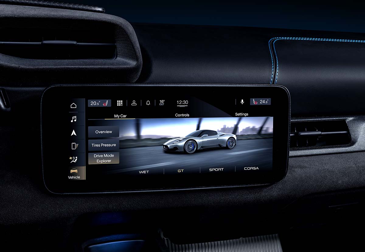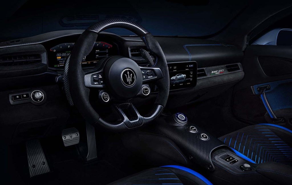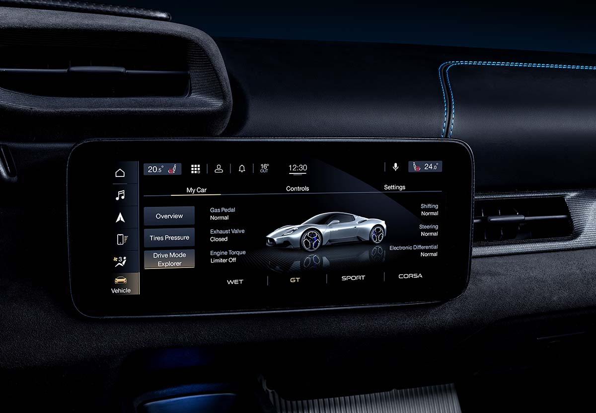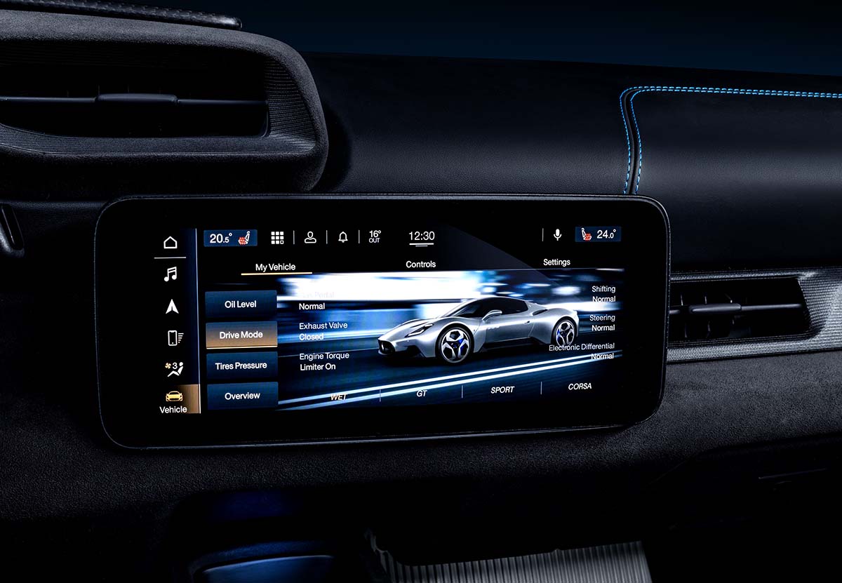 Una vez dentro de la cabina, el conductor siempre es central, y nada debe distraerlos de la experiencia de conducción deportiva. Cada componente tiene un propósito y está completamente orientado al conductor. Formas simples, muy pocos bordes afilados y distracciones mínimas. Dos pantallas de 10 pulgadas: una para la cabina y otra para el Maserati Touch Control Plus (MTC Plus MIA).
