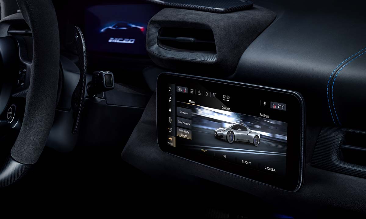 El nuevo MC20 se conectará en todo momento con el programa MaseratiConnect. La gama completa de servicios incluye navegación conectada, Alexa y Wifi Hotspot y también se puede gestionar a través del teléfono inteligente Maserati Connect o smartwatch App.