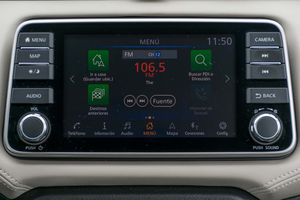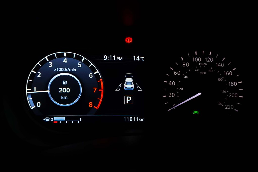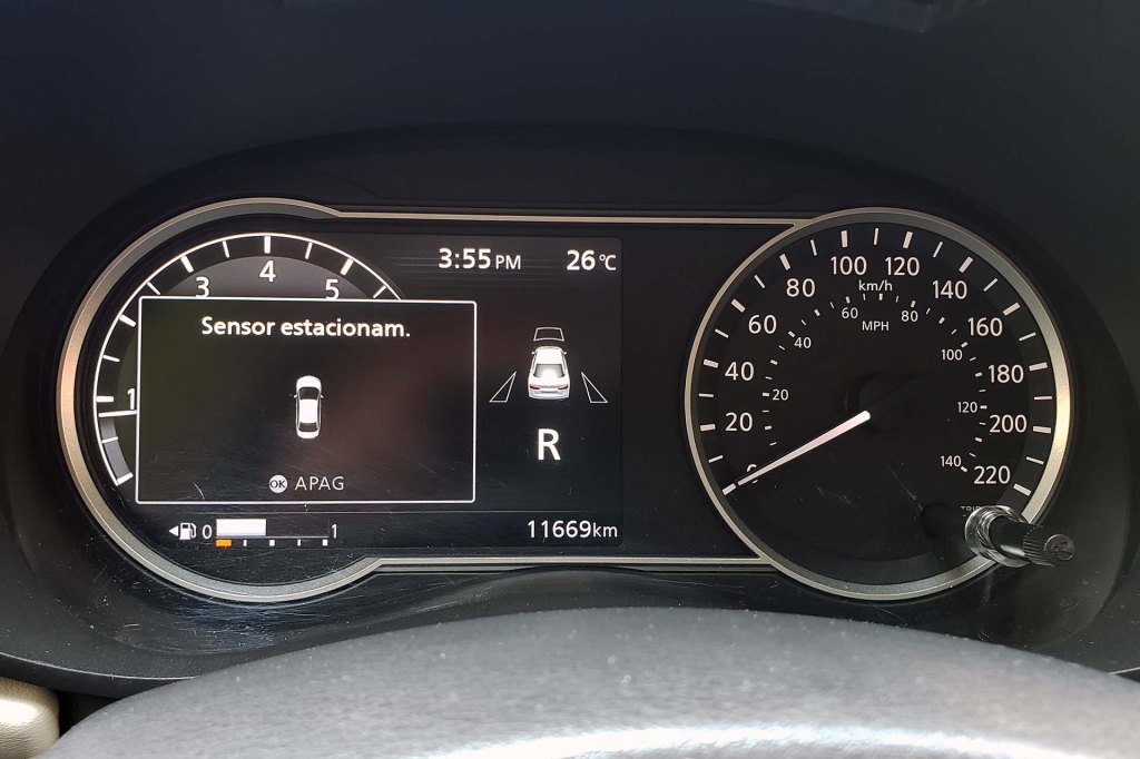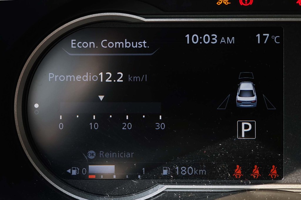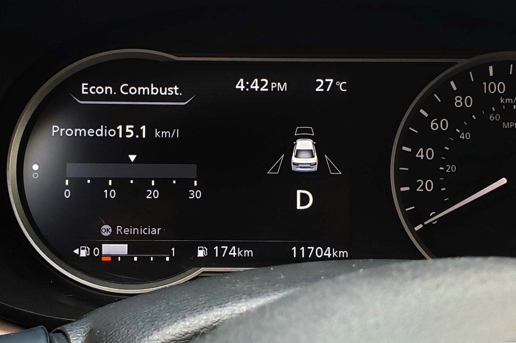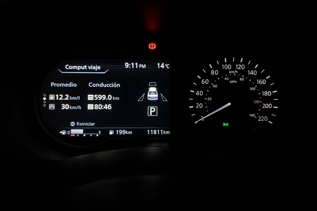 En el panel de instrumentos tenemos el velocímetro análogo acompañado del nuevo el Nissan Advance Drive Assist, que consiste en una pantalla de 7 pulgadas donde podemos elegir algunas funciones como el tacómetro, rendimiento de combustible, temperatura, lo que estés reproduciendo, una brújula además de la temperatura y el monitoreo del sistema de prevención de colisión frontal y punto ciego ademas de las alertas del vehículo (incluyendo la alerta de objetos olvidados en los asientos traseros).