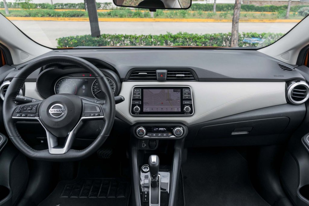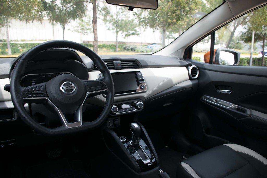 El Nissan Versa estrena un volante con corte en “D”, dándole un diseño más actualizado a la cabina, aunque hay que mencionar que este volante ya lo había visto en otro modelo de la marca (en la X-Trail híbrida para ser más preciso), este volante con ajuste de altura y profundidad está tapizado en piel e incorpora sólo los controles para el sistema de infoentretenimiento, control de voz y las funciones de la computadora de viaje, en este caso, el Versa no cuenta con control crucero.