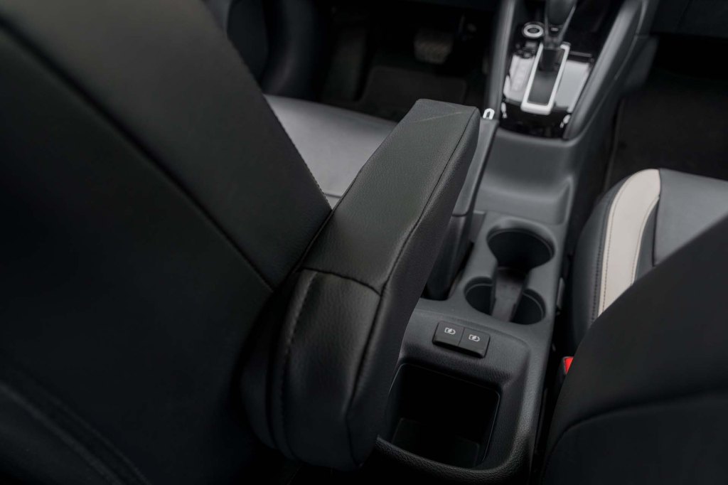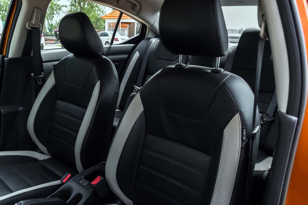 En el interior del Nissan Versa Exclusive tenemos los asientos tapizados en piel con la opción de tenerlos en su mayoría en color negro con detalles en marfil y viceversa, estos asientos son de ajuste manual y el del conductor te permite moverle a la altura para brindar una mejor posición de manejo además de contar con un modesto descansabrazo abatible.
