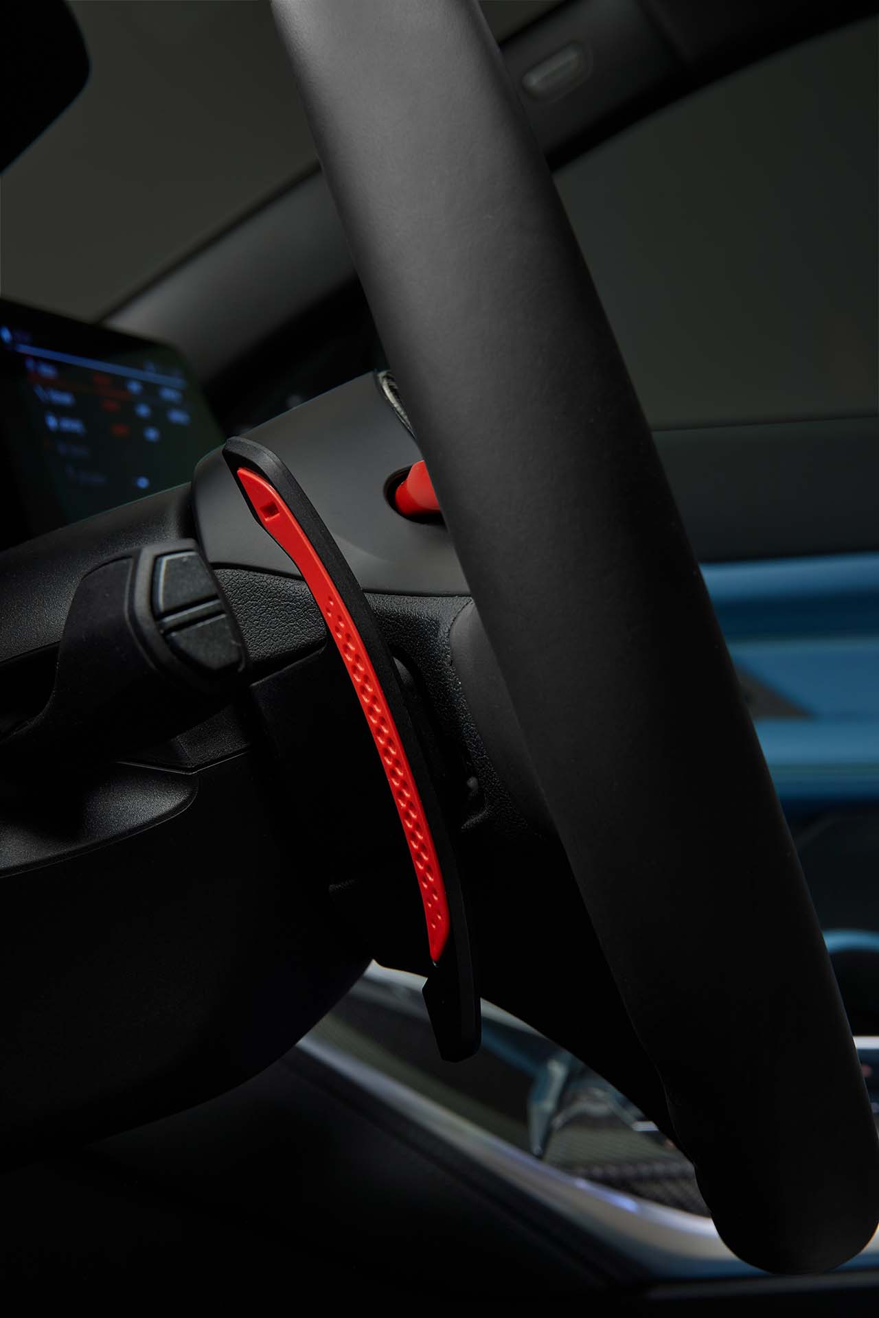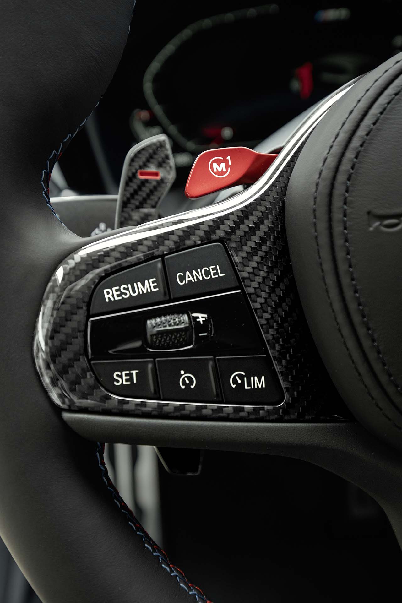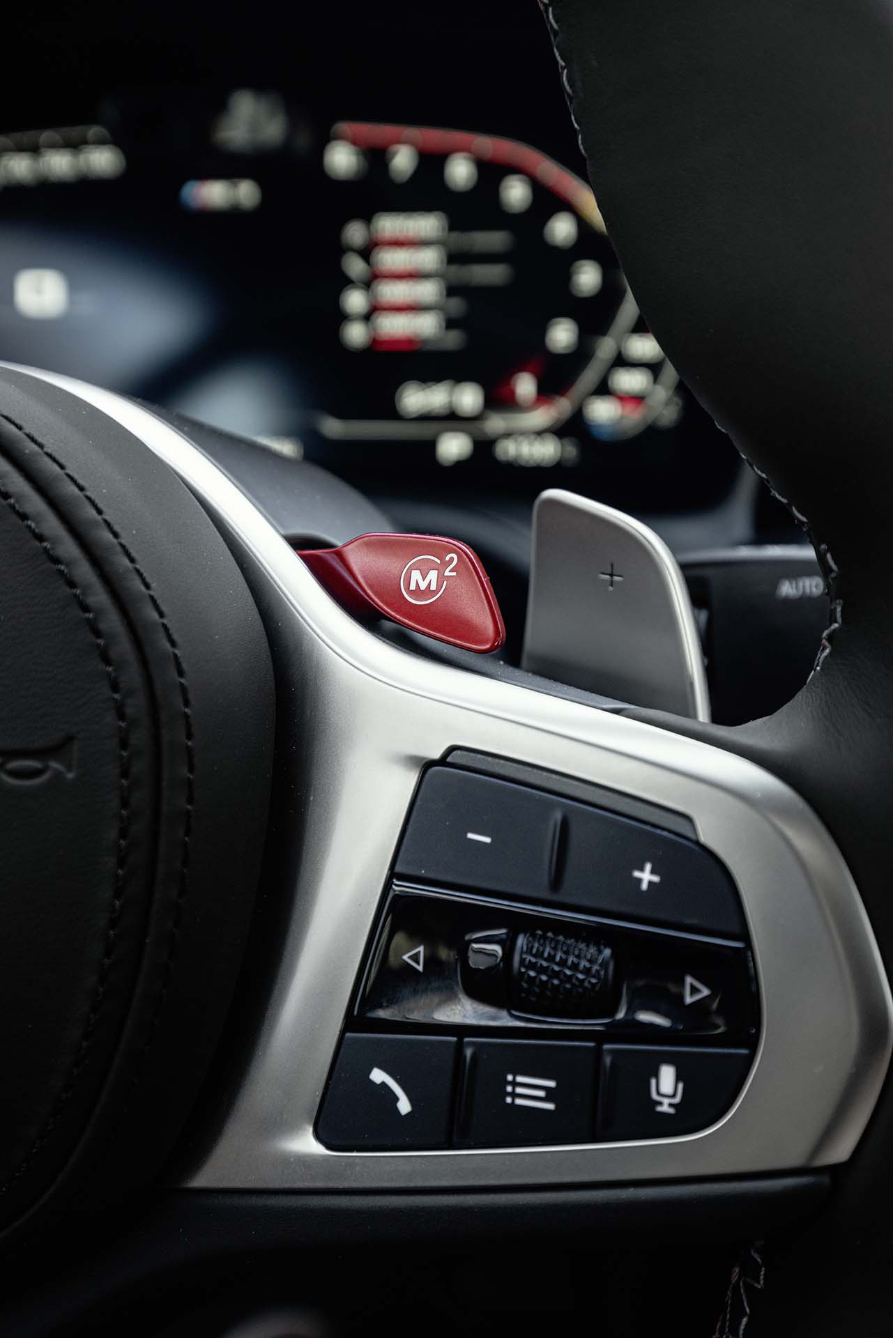 El panel de control de la consola central también alberga el botón de modo M de serie. Esto se puede usar para ajustar las respuestas y características de los sistemas de asistencia al conductor y las pantallas en el cuadro de instrumentos y Head-Up Display para brindar una experiencia de conducción adecuada a la situación en cuestión y digna de la insignia M. El conductor puede elegir entre la configuración ROAD y SPORT, y con el modo TRACK desarrollado para salidas en circuitos de carreras agregado al arsenal cuando se especifica el sistema M Drive Professional.
