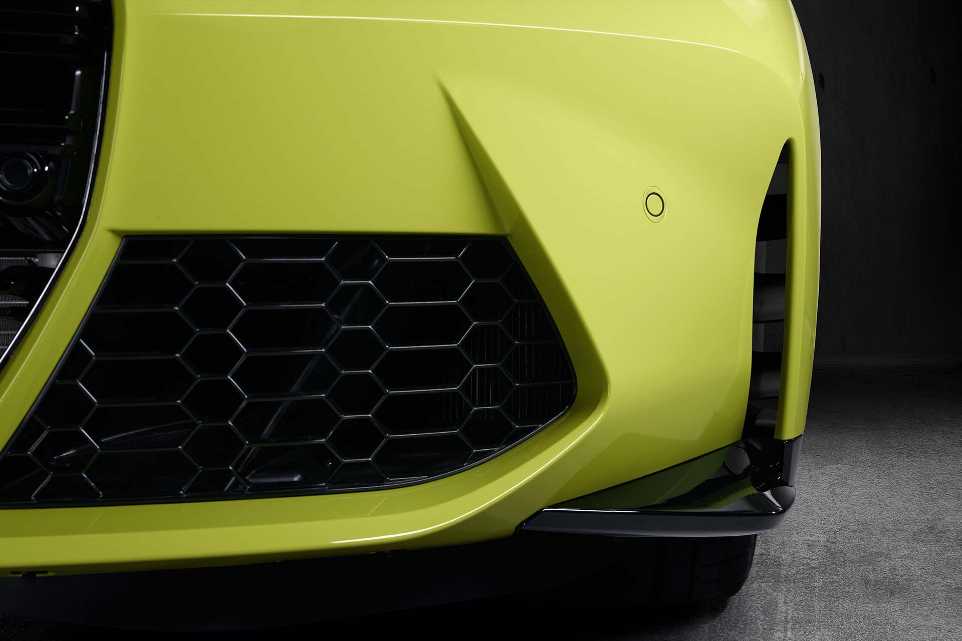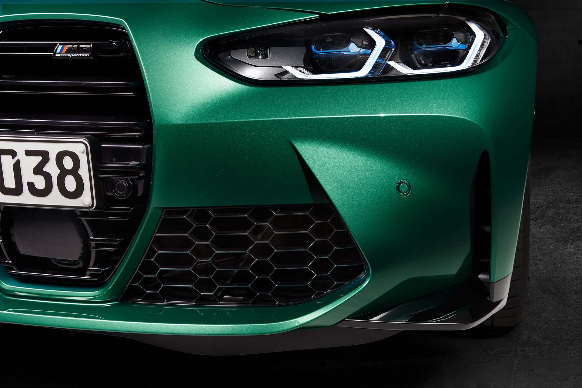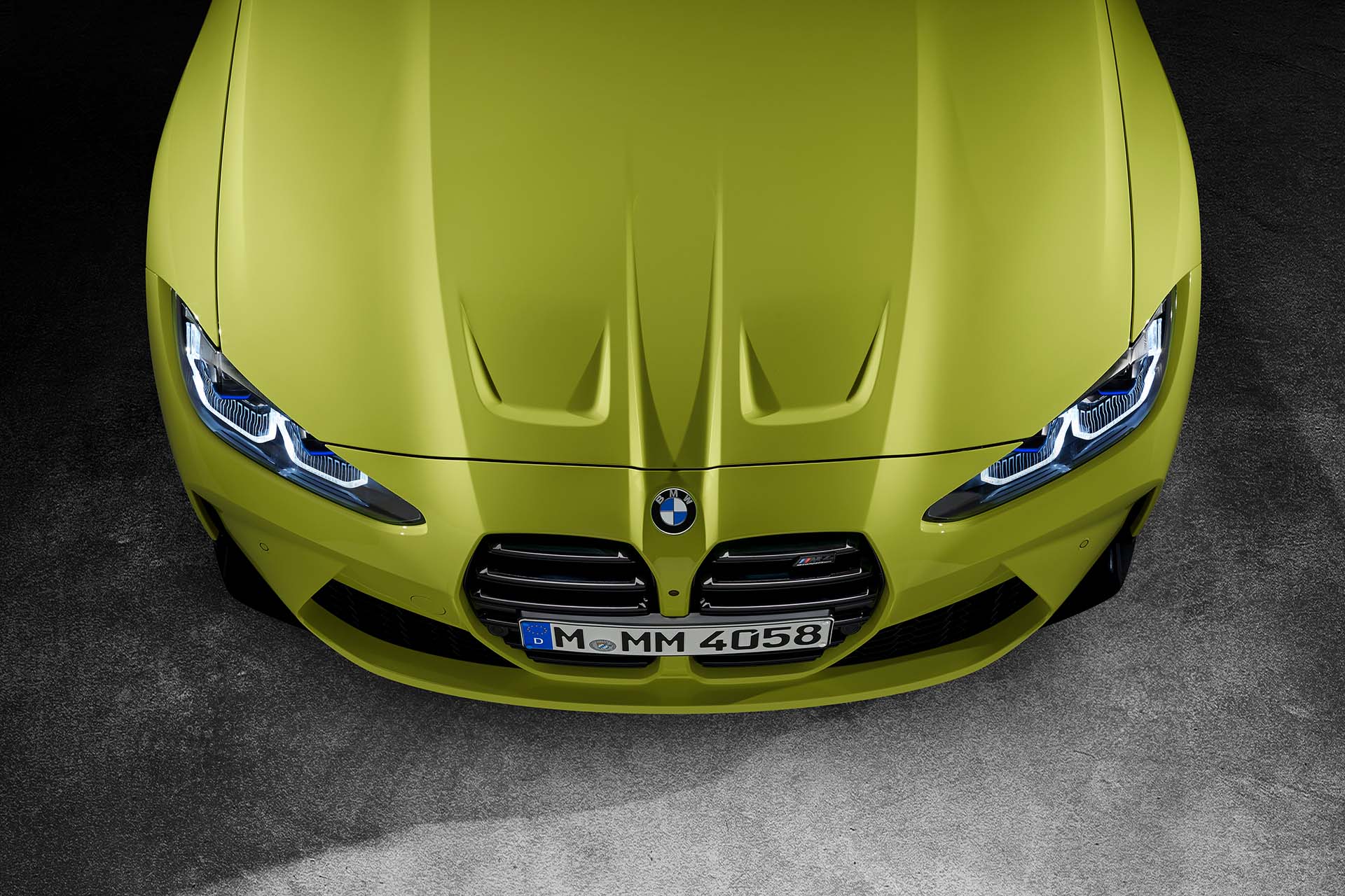 El diseño distintivo de la carrocería del nuevo BMW M3 Sedán y el nuevo BMW M4 Coupé transmite una declaración más audaz que nunca de la supremacía del desempeño y la experiencia de conducción emocionalmente atractiva que tenemos a mano. Las características de diseño específicas de M, firmemente invertidas en los requisitos funcionales de los vehículos deportivos de alto desempeño, se integran armoniosamente en el lenguaje de diseño moderno. Los factores que contribuyen a la apariencia visualmente impactante de los dos modelos incluyen la versión específica de M de la gran parrilla doble en forma de riñón vertical de BMW con barras horizontales, las salpicaderas poderosamente esculpidas con llamativas branquias M y los estribos laterales prominentemente extendidos con piezas de fijación para las secciones delantera y trasera El sedán y el coupé también tienen un toldo hecho de polímero reforzado con fibra de carbono (CFRP) con aletas optimizadas aerodinámicamente, un alerón trasero y los dos pares de tubos de escape que ahora son una característica habitual de los vehículos M.