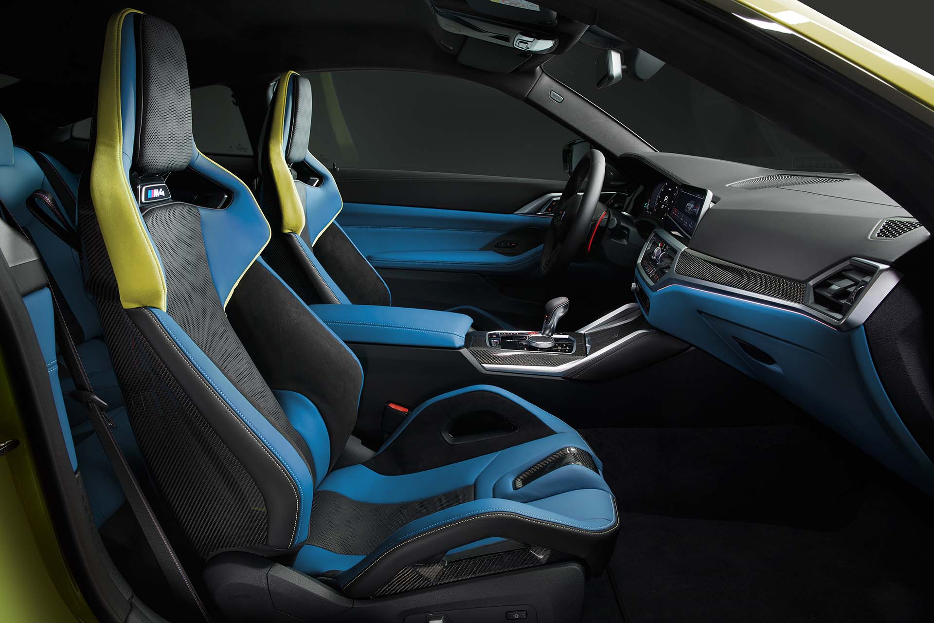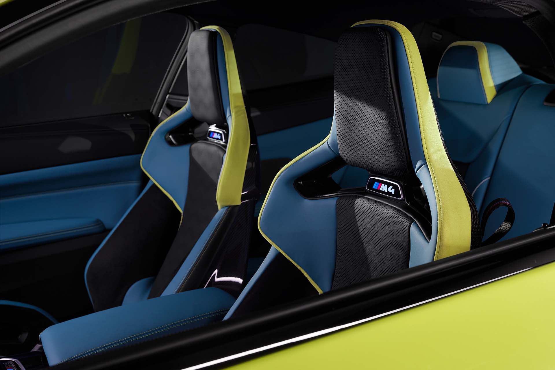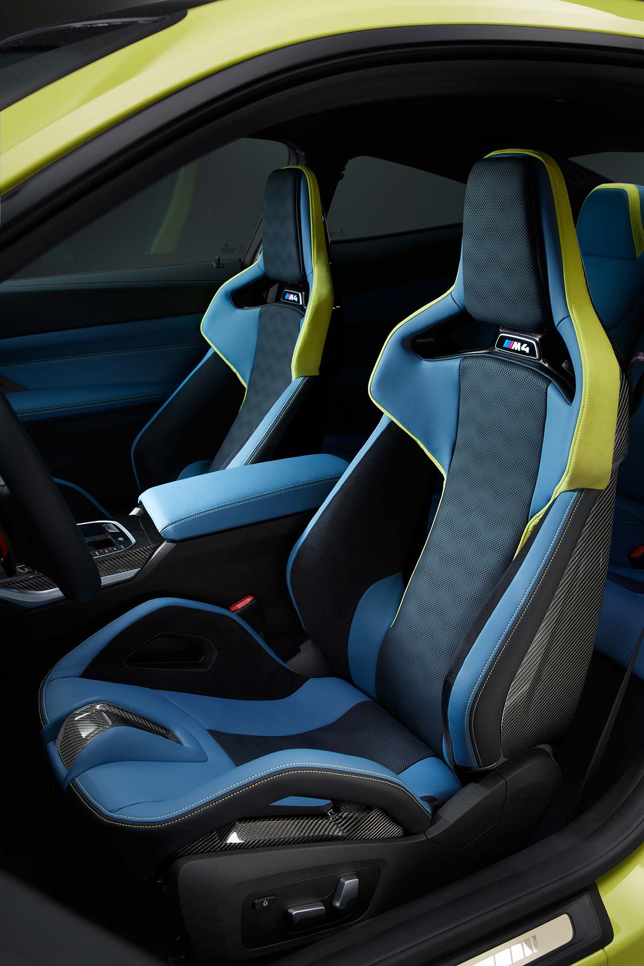 Dentro del nuevo BMW M3 Sedán y el nuevo BMW M4 Coupé, las superficies claramente estructuradas y un diseño de cabina ergonómicamente impecable aseguran que el conductor se concentre al cien por ciento en la intensa experiencia de conducción. Los asientos deportivos M de nuevo desarrollo, eléctricamente ajustables, y el tapizado de piel Merino de grano fino con características extendidas vienen de serie, con ventilación de asiento también disponible por primera vez. Un aspecto destacado de la lista de opciones son los nuevos asientos tipo cubo M Carbon con un diseño basado en la estructura, que combinan la funcionalidad de las carreras con una construcción liviana, comodidad en largas distancias y una mano de obra suntuosa. Estos innovadores asientos tienen reposacabezas integrales que se pueden desmontar para conducir en pista, una placa de modelo iluminada y ajuste eléctrico. Su estructura inspirada en los vehículos de carreras también permite el uso de cinturones de seguridad multipunto.