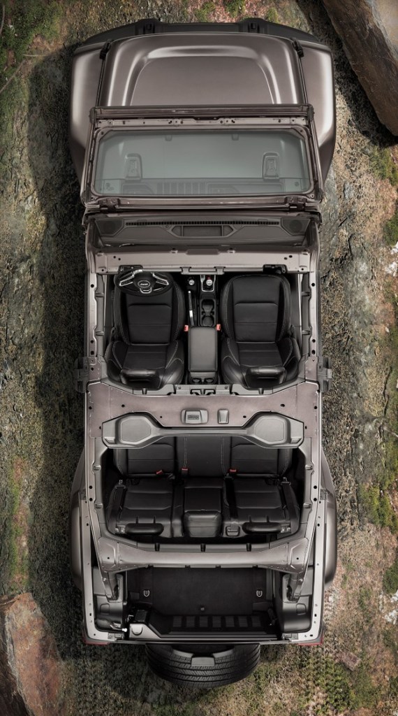 Dos puertos USB en la parte delantera y otros dos al alcance de los ocupantes traseros se conectan al centro “multimedia”. Varias tomas de corriente auxiliares de 12 V ubicadas a lo largo y ancho del interior del nuevo Wrangler.