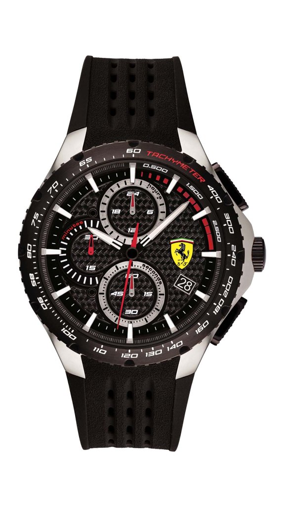 La esfera negra evoca a la fibra de carbono, material emblemático de los monoplazas, dentro de ella destaca el icónico caballo rampante situado a las 3 y marcadores de varilla flotante. Su correa de silicona negra posee un original motivo perforado, inspirado en el diseño de los coches Ferrari, brindando una apariencia deportiva y comodidad en la muñeca.