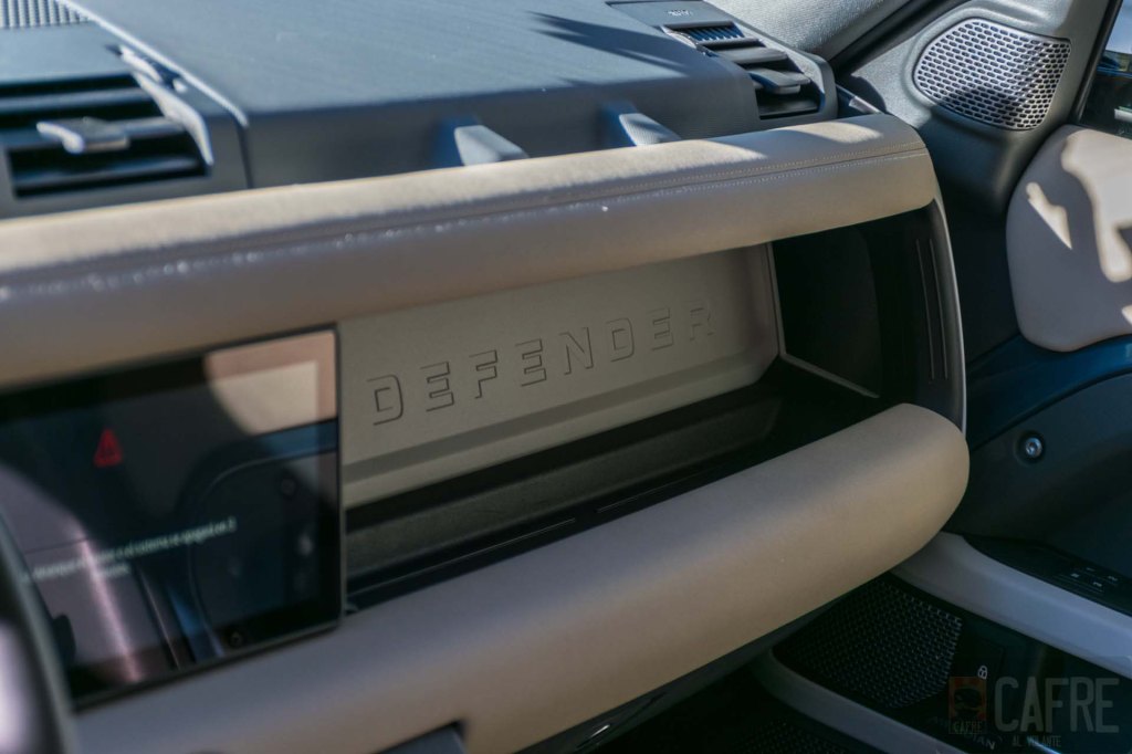 Ingresar al Defender es como la nueva tendencia de acampar con lujo (conocido como “glampling”), el interior muestra un diseño muy refinado, comenzando por los asientos tapizados en piel Grained en Acorn y tejido Robust Woven con interior en Lunar (así lo describe la marca), estos asíentos te permite disfrutar de un confort al conducir al tener un buena posición de manejo, el tablero presume su diseño la palabra DEFENDER estampada en el lado del copiloto, los espacios en esta parte te permite dejar algunos objetos como el celular además que incorpora un cargador USB en él.
