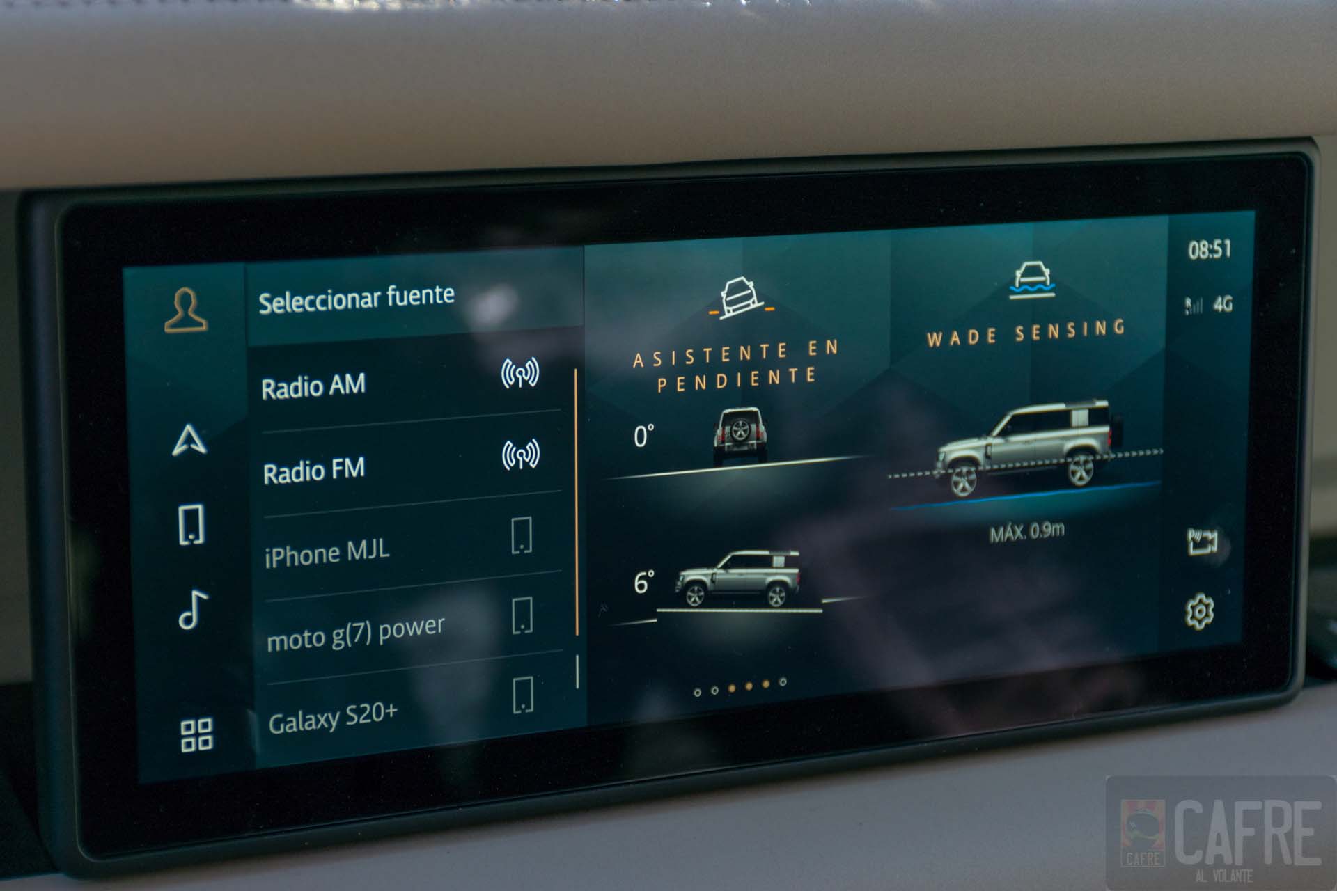 Al centro tenemos la pantalla touch de 10 pulgadas que nos permitirá además controlar las funciones de conectividad y multimedia, nos servirá para monitorear nuestro trayecto gracias que reproducirá las cámaras que tenemos alrededor del Defender, no sólo la de revesa, si no también la vista ClearSight1 que te permite tener varias vistas del exterior, debajo del vehículo y las ruedas para saber dónde estás andando.