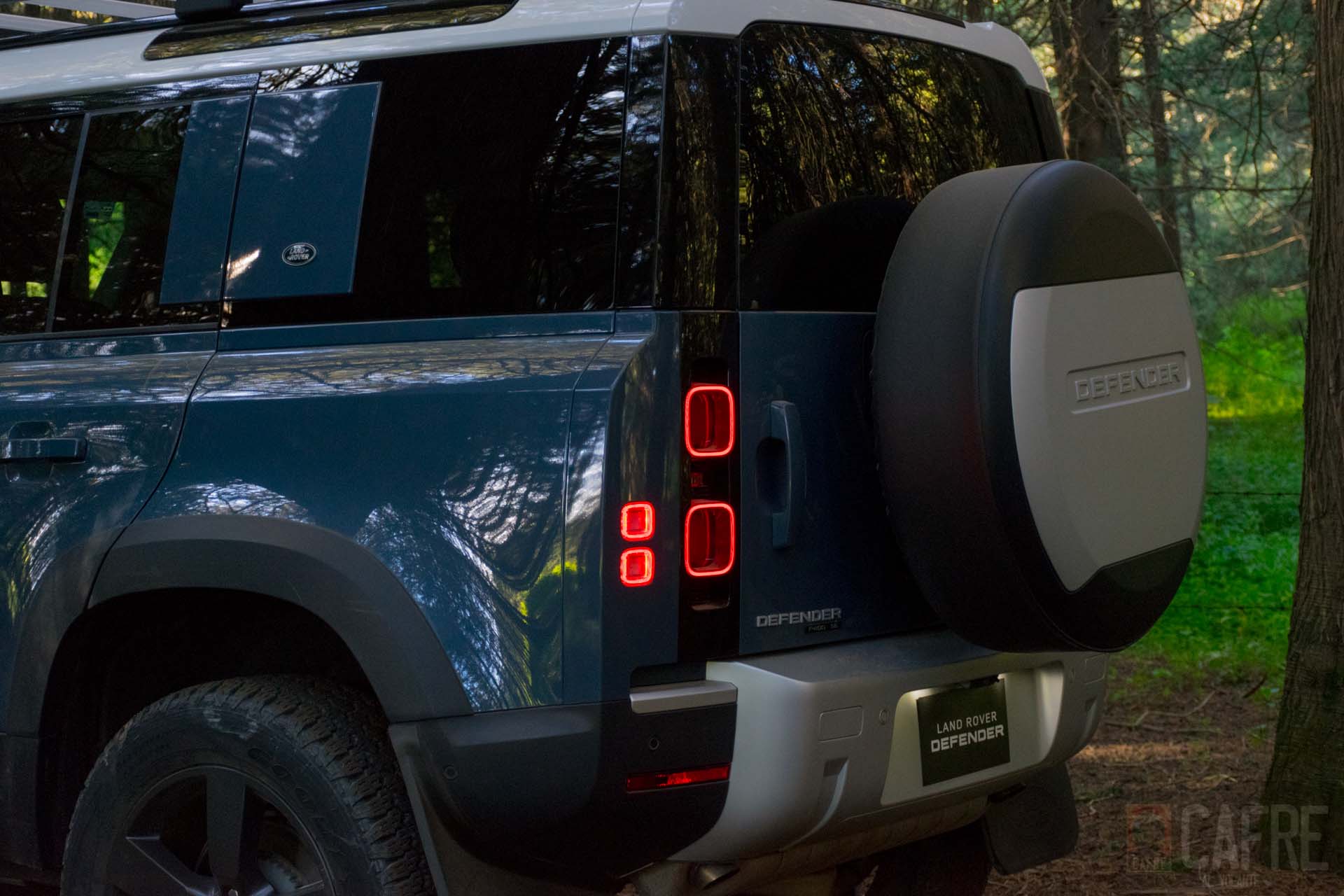 Al haberse caracterizado el diseño cuadrado de las generaciones pasadas, el nuevo Defender luce más moderno, gracias a sus líneas más esculpidas, pero aún conserva ciertos detalles que asemejan a sus antecesores, como los faros delanteros redondos, la parte trasera cuadrada con la llanta de refacción montada en la quinta puerta y la iluminación alpina, que es una entrada de luz en el filo del techo para la segunda fila. Las luces traseras son cuadradas donde sólo se ilumina el contorno haciendo resaltar el nuevo diseño. Para darle capacidad de un todo terreno los ejes se encuentran a los extremos para darle un mejor ángulo de 38° de ataque y 40° de salida.
