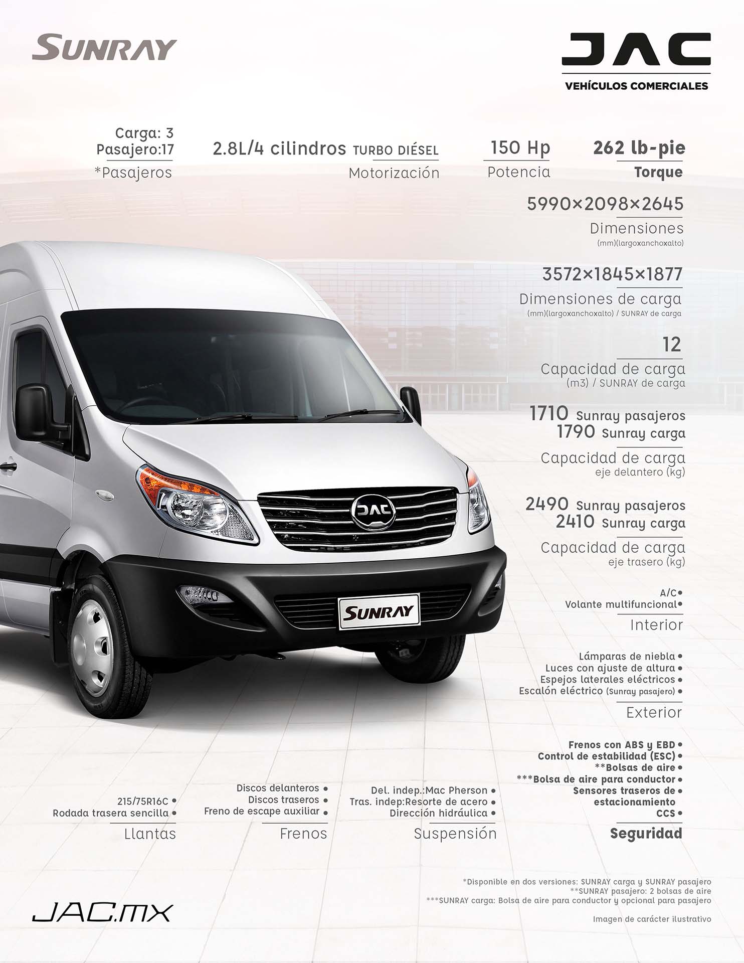 JAC Sunray llegará a México en 2 versiones de combustión en su modalidad carga y pasajeros, ambas cuentan con un motor a diésel, 4 cilindros, transmisión manual de 6 velocidades, 150 caballos de fuerza y 262 libras pie de torque. Suspensión delantera independiente tipo McPherson, suspensión trasera de resorte de acero y rodada sencilla.