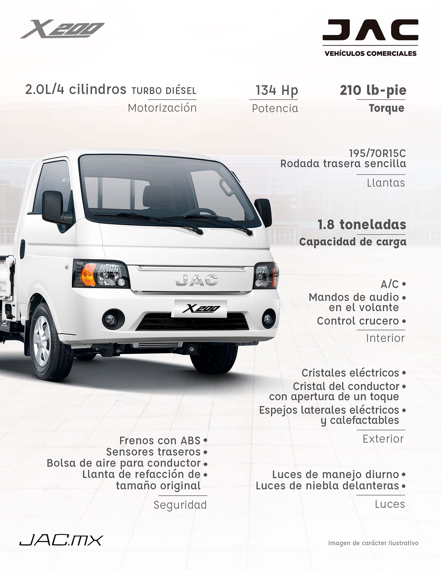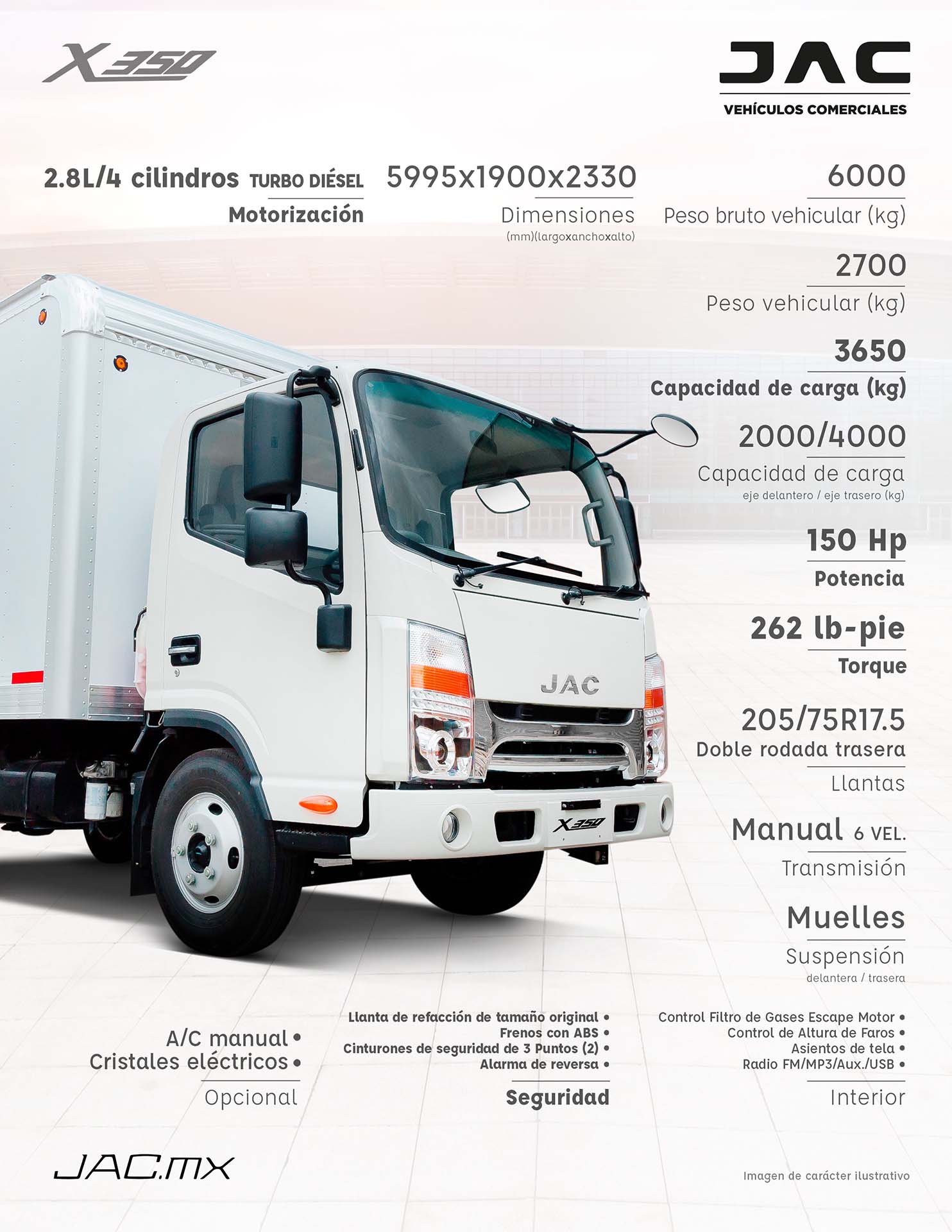 JAC X350 es para aquellos que requieren una capacidad de carga de hasta 3.7 toneladas sobre un robusto chasis de 6 m de largo, y con la seguridad de frenos ABS. X250 y X350, al igual que Sunray, estarán disponibles a partir de noviembre de este año con un precio de $570,000 pesos y $650,000 pesos, respectivamente.