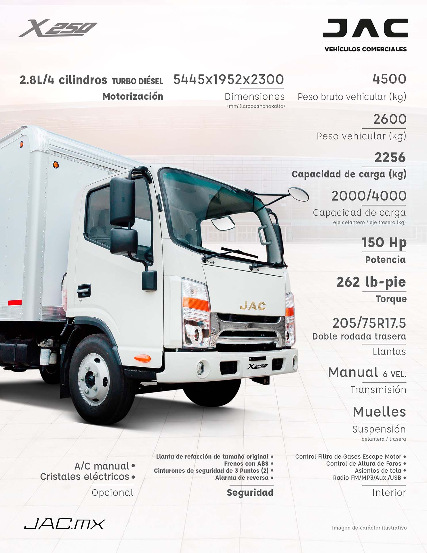 JAC X250 es un vehículo de carga ligero con capacidad de carga de 2 toneladas y media, que al igual que todos los modelos, es el aliado ideal para la última milla. Destaca por un motor 2.8L turbo diésel de 4 cilindros que garantiza el mejor rendimiento de combustible. Está equipado con el motor más grande y poderoso de este segmento con una potencia de 150 caballos de fuerza y 262 libras-pie de torque.