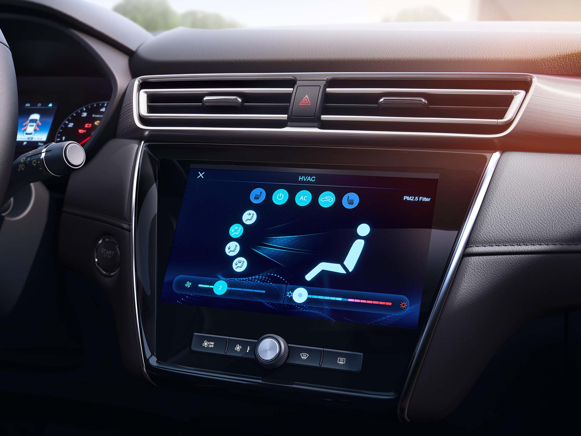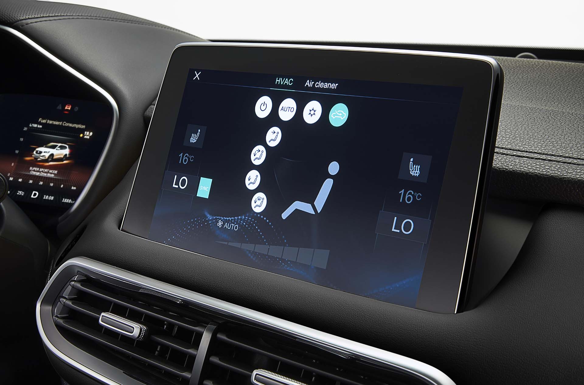 - La pantalla flotante de 10.1” con tecnología táctil, nos brinda un diseño minimalista ya que no tiene botones, que te permitirá visualizar y ajustar las funciones principales de la HS bajo nuestro sistema “MG Connect” con un simple toque