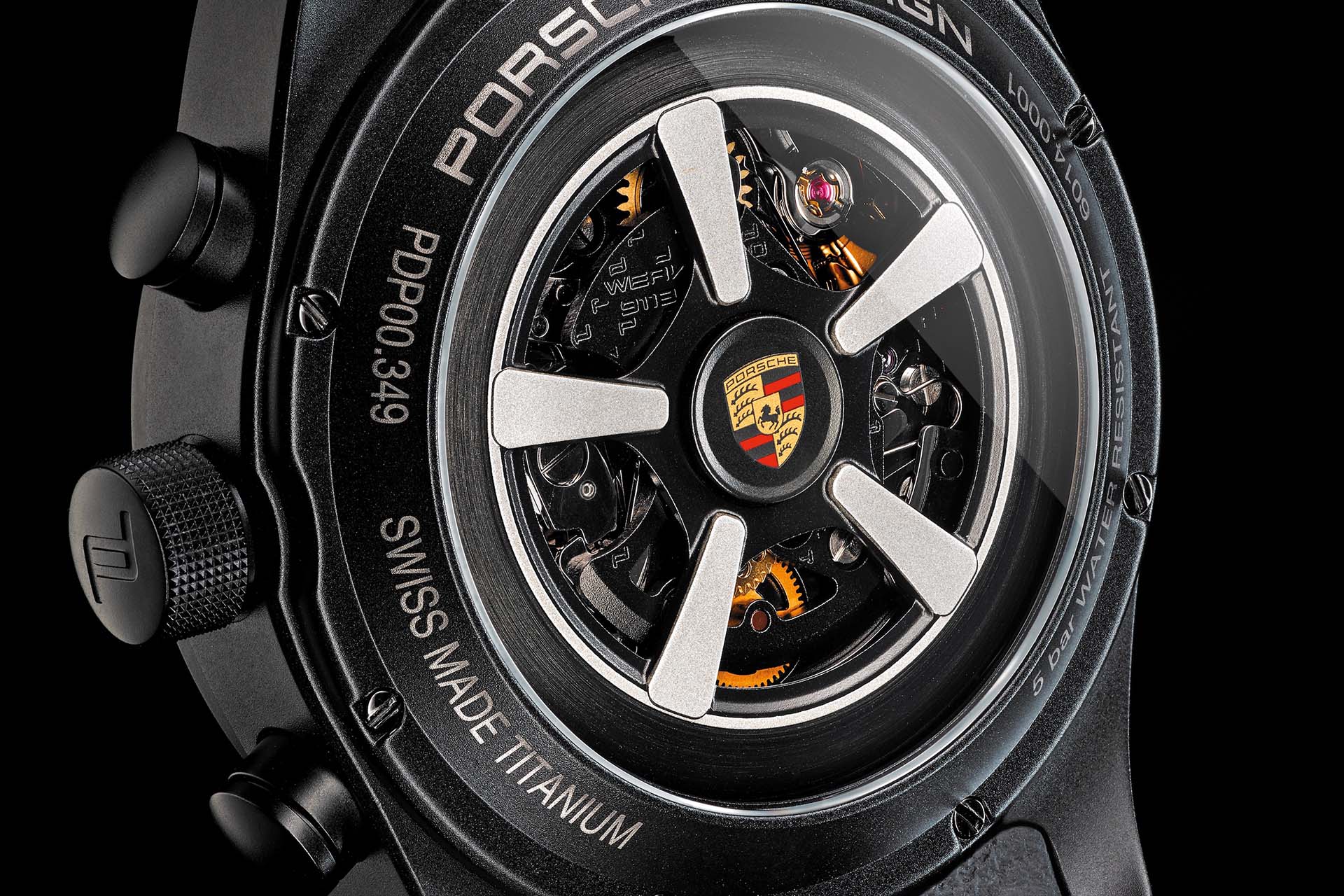 En la fábrica, incluso se cosen a mano las correas con el mismo hilo que se emplea en los asientos del 911, aunque con un grosor más fino. Las correas de titanio de color gris o negro pueden convertirse en complementos, ya que gracias a su rápido sistema de cambio, permite al usuario obtener un nuevo diseño en pocos segundos. La base de cristal de la parte posterior deja a la vista el mecanismo automático de fabricación propia con su rotor de cuerda. El rotor también se puede individualizar para que combine con la forma y el color de las llantas de cada deportivo, incluido el escudo central de Porsche.