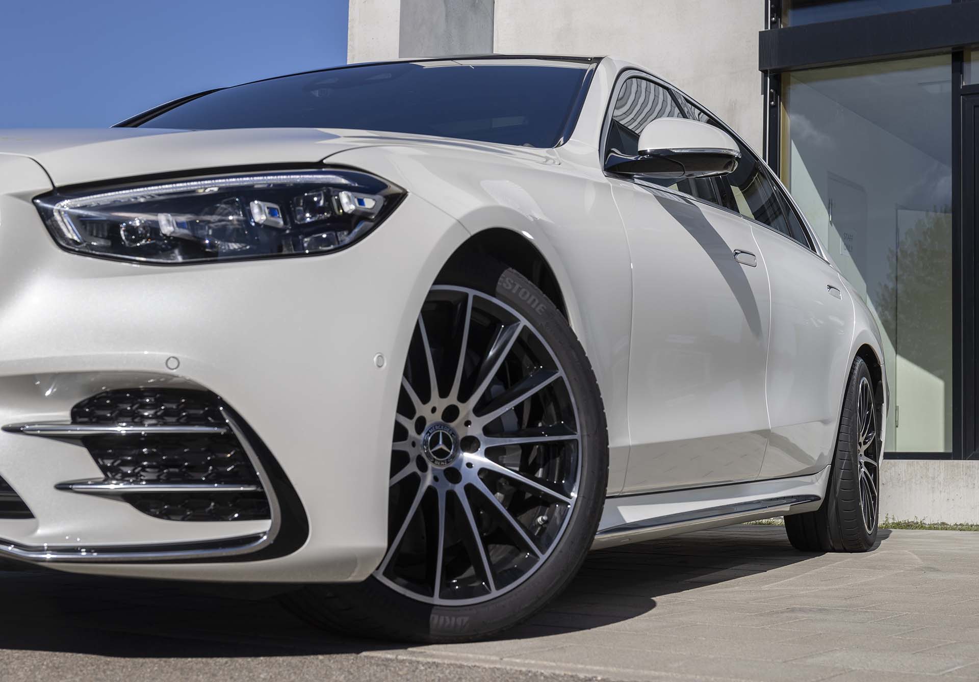Con un voladizo delantero corto, una distancia entre ejes larga y un voladizo trasero equilibrado, el Clase S está diseñado como un sedan clásico con proporciones perfectas. La vía ancha y las ruedas empotradas con diseños modernos le dan al vehículo un aspecto musculoso. Las llamadas líneas de caracteres se han reducido considerablemente a lo largo de los lados. Las superficies hábilmente contorneadas con un aspecto esculpido crean efectos de luz especiales. La sección delantera impresiona con su parrilla del radiador de alto estatus.