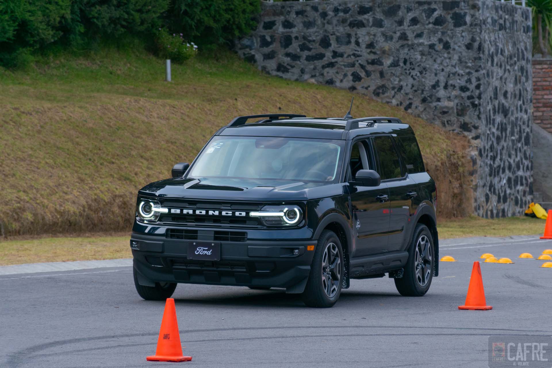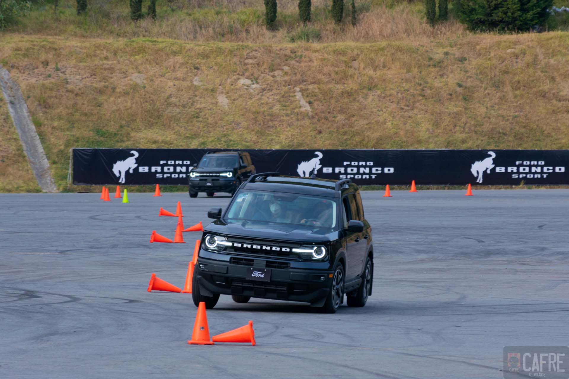Al igual que en la prueba off road, para la actividad en asfalto, primero tuvimos una vuelta con el instructor, esto para conocer el trayecto y también ver el desempeño si es que no acostumbras a manejar de una manera más agresiva. La primera parte de esta prueba era para activar las asistencias de conservación de carril y el control crucero inteligente (gracias a que tenemos la asistencia Co-Pilot 360), pero mejor decidimos pisar el acelerador y notar la respuesta del motor de 3 cilindros, debo decir que, considerando las proporciones de la Bronco Sport, este motor no lo hace tan mal. Llegamos a la zona de curvas, todas ellas bastante cerradas, aquí, le dimos con singular alegría al “volantazo” ya que al tener el Control de Tracción Avanzada (AdvanceTrac®) con Control de Estabilidad Antivolcadura (RSC®) podíamos entrar de una manera más agresiva, activando las asistencias manteniendo controlada y hasta frenando la Bronco para no perder control. Con su tracción 4×4 ofrece una buena adherencia al pavimento, esto lo pudimos sentir en la zona de slalom llegando a percibir que el eje trasero quería divertirse sin llegar a perder el control. Gracias a su suspensión multibrazo atrás y con struts al frente, una zona de topes topes y boyas metálicas las pasamos a una buena velocidad sin llegar a sentirlas.