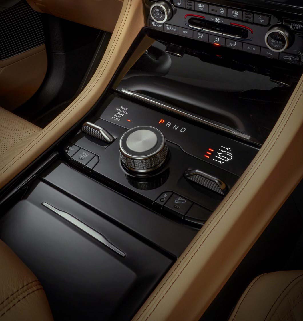 La ejecución de la consola central, realineada para mejorar la accesibilidad, merece un capítulo aparte. Con un acabado brillante en color negro piano cuenta con un nuevo selector de cambio rodeado por los interruptores de control de la altura de marcha y del Selec-Terrain. En su parte frontal se encuentran nuevos portavasos, y espacio para alojar dos dispositivos inalámbricos que pueden ser alimentados con un cargador inalámbrico opcional.