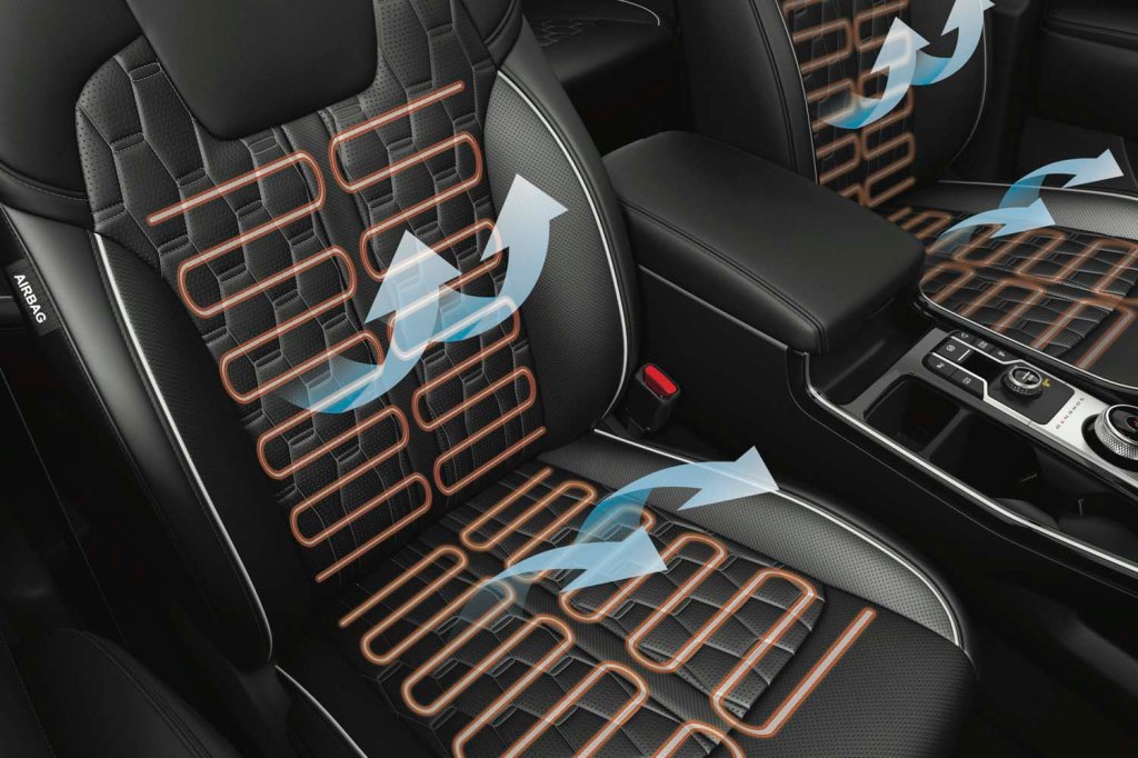 Los asientos delanteros (SX) cuentan con calefactor y ventilación, mientras que el asiento del conductor es eléctrico de 10 posiciones con memoria en la versión más equipada y de 8 con soporte lumbar en LX, EX y EX Pack.